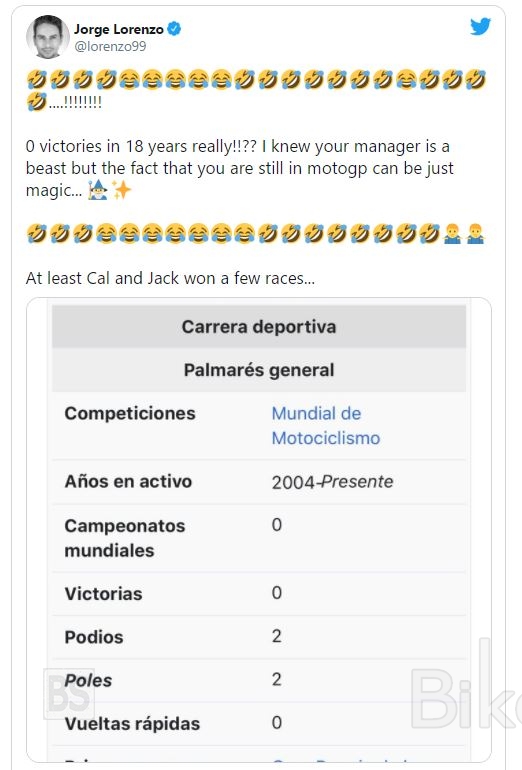 Και, συνέχισε, εξαπολύοντας επίθεση με ένα προσβλητικό σχόλιο εναντίον του Aleix Espargaro: «Μηδέν νίκες σε 18 χρόνια, πραγματικά; Ήξερα ότι ο μάνατζερ σου (ο Albert Valera, ήταν για καιρό και μάνατζερ του Lorenzo) είναι φοβερός, αλλά το γεγονός ότι είσαι ακόμα στο MotoGP είναι κάτι που μπορεί να είναι μόνο προϊόν μαγείας … Τουλάχιστον ο Cal (Crutchlow) και ο Jack (Miller) κέρδισαν μερικούς αγώνες»