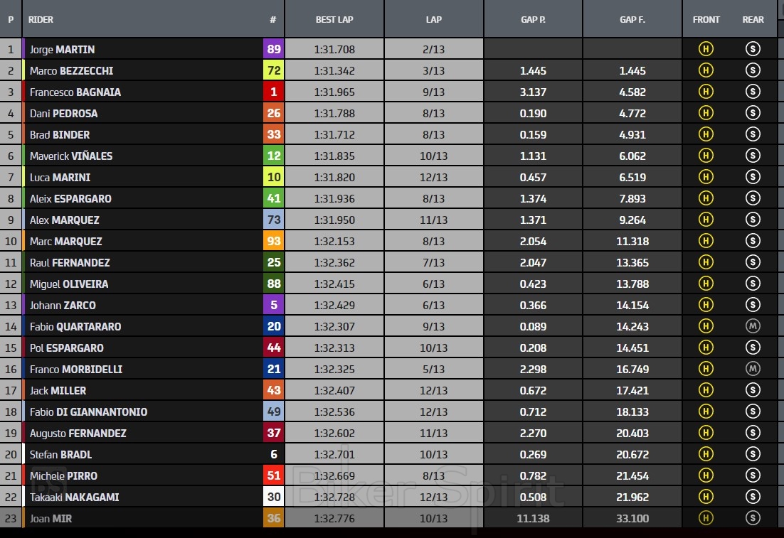 Δύσκολος αγώνας και για τον Jack Miller που τερμάτισε 15ος με το KTM, μπροστά από τον οδηγό της ομάδα GASGAS,. Pol Espargarò, την Ducati Gresini του Fabio di Giannantonio και τη Yamaha του Franco Morbidelli. Εικοστή θέση για τον δοκιμαστή της Ducati, Michele Pirro.