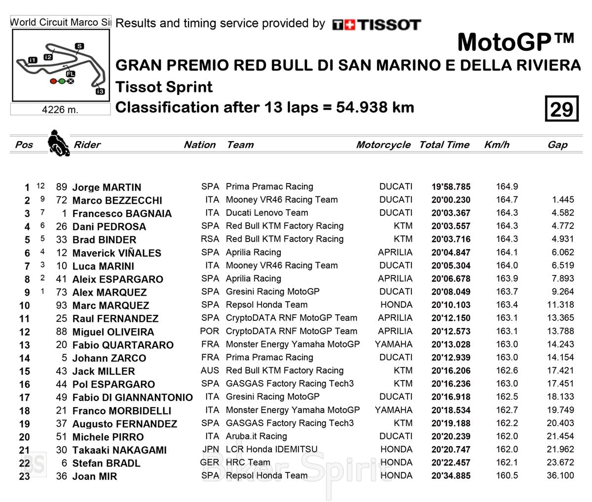 Στην 7η θέση τερμάτισε ένα ακόμα Ducati, αυτό του Luca Marini, μπροστά από το δεύτερο Aprilia του Aleix Espargaro, ενώ την 9αδα που παίρνει βαθμούς έκλεισε ένα ακόμα Ducati με τον Alex Marquez , ενώ την πρώτη δεκάδα του αγώνα έκλεισε, το πρώτο Honda και το μοναδικό Ιαπωνικό στην δεκάδα με τον Marc Marquez!
