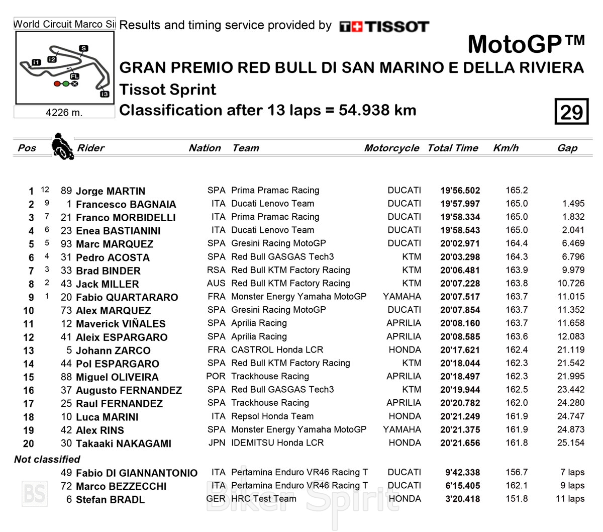 Στην παγκόσμια κατάταξη ο Martin μεγαλώνει την διαφορά από τον Bagnaia φτάνοντας στο + 26, ενώ στην 3η και 4η θέση με ισοβαθμία είναι τώρα Marc Marquez και Enea Bastianini, με 77 βαθμούς πίσω από την κορυφή.