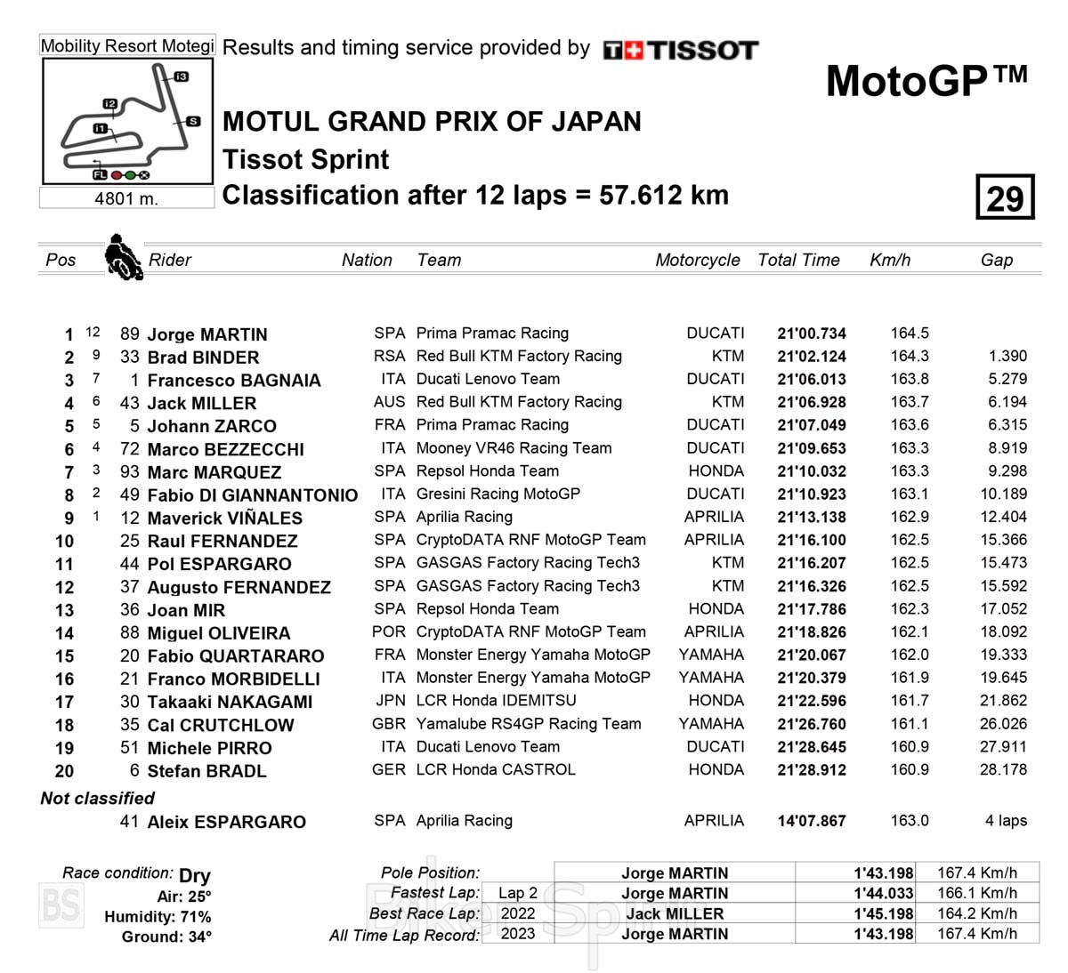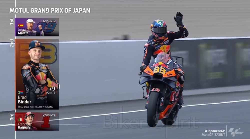 Συνεχίζοντάς μια φοβερή εμφάνιση στην Ιαπωνία ο Jorge Martin, κέρδισε άνετα τον αγώνα Sprint, με διαφορά 1.390s από τον δεύτερο χωρίς να φανεί να ανησυχεί σε όλο τον αγώνα, αφού ο δεύτερος Binder δεν μπόρεσε να τον απειλήσει σε καμία στιγμή!
