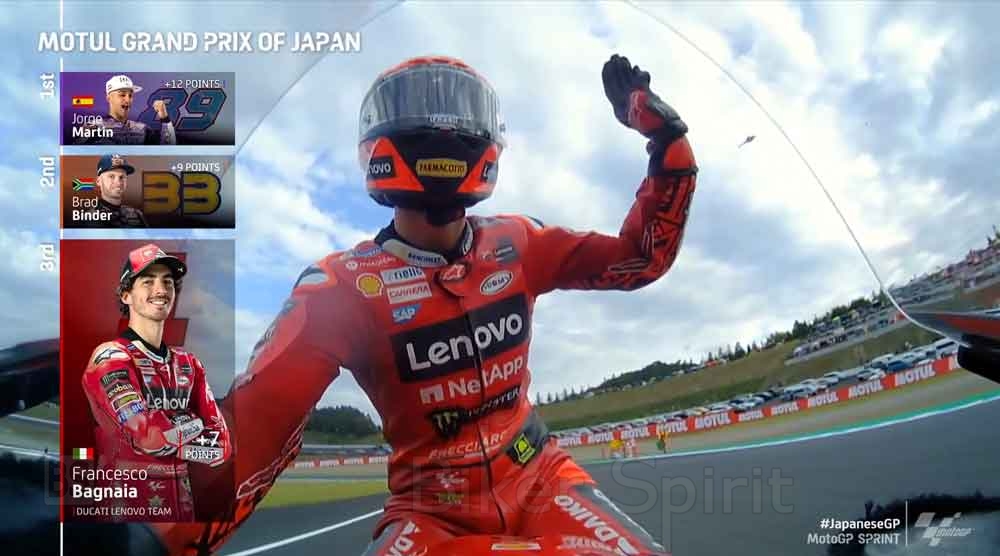 Το βάθρο του αγώνα Sprint έκλεισε ο Pecco Bagnaia που δεν κατάφερε να κρατηθεί στην κορυφη μετα την εκκίνηση και βρέθηκε γρηγορά 4ος , με τον Marc Marquez κολλημένο πίσω του για τους τρεις πρώτους γύρους, αλλα στην συνέχεια ξέφυγε και έφτασε το Miller όπου έδωσαν μια θεαματική μάχη στους τελευταίους γύρους με τον Ιταλό να κερδίζει τον Αυστραλό και να παίρνει το βάθρο και πολύτιμους βαθμούς που τον καρτούν επικεφαλής της βαθμολογίας!