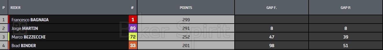 Τώρα το πρωτάθλημα έχει στενέψει ακόμα περισσότερο στην βαθμολογία με τον Bagnaia να είναι μόλις 8 βαθμούς μπροστά από τον Martin, ενώ ακολουθεί και ο Bezzecchi με 47 βαθμούς και ο Binder, αρκετά πιο πίσω με 98 βαθμούς διαφορά!