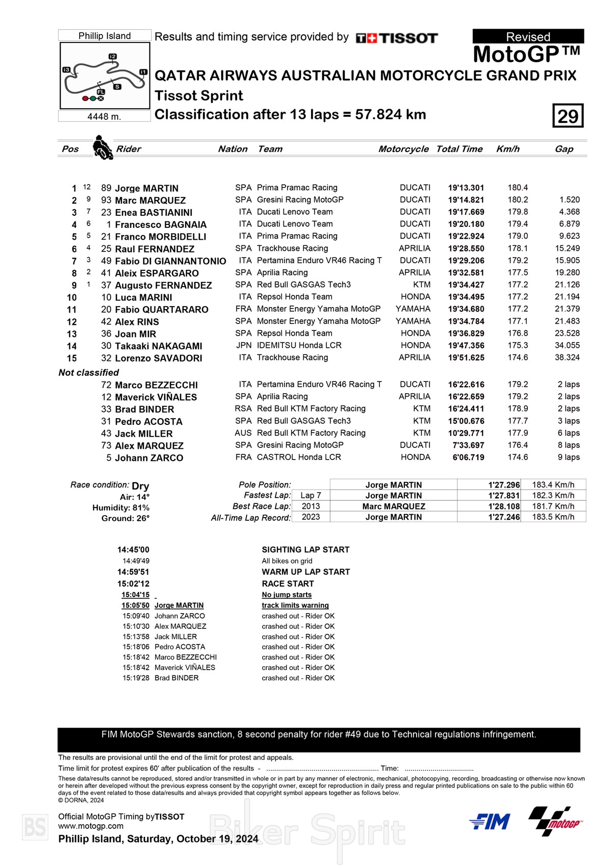 Πτώσεις είχαν επίσης οι Johann Zarco (Honda LCR), Alex Marquez (Ducati Gresini), Jack Miller (KTM), Pedro Acosta (GASGAS GASGAS Tech3), Brad Binder (KTM).