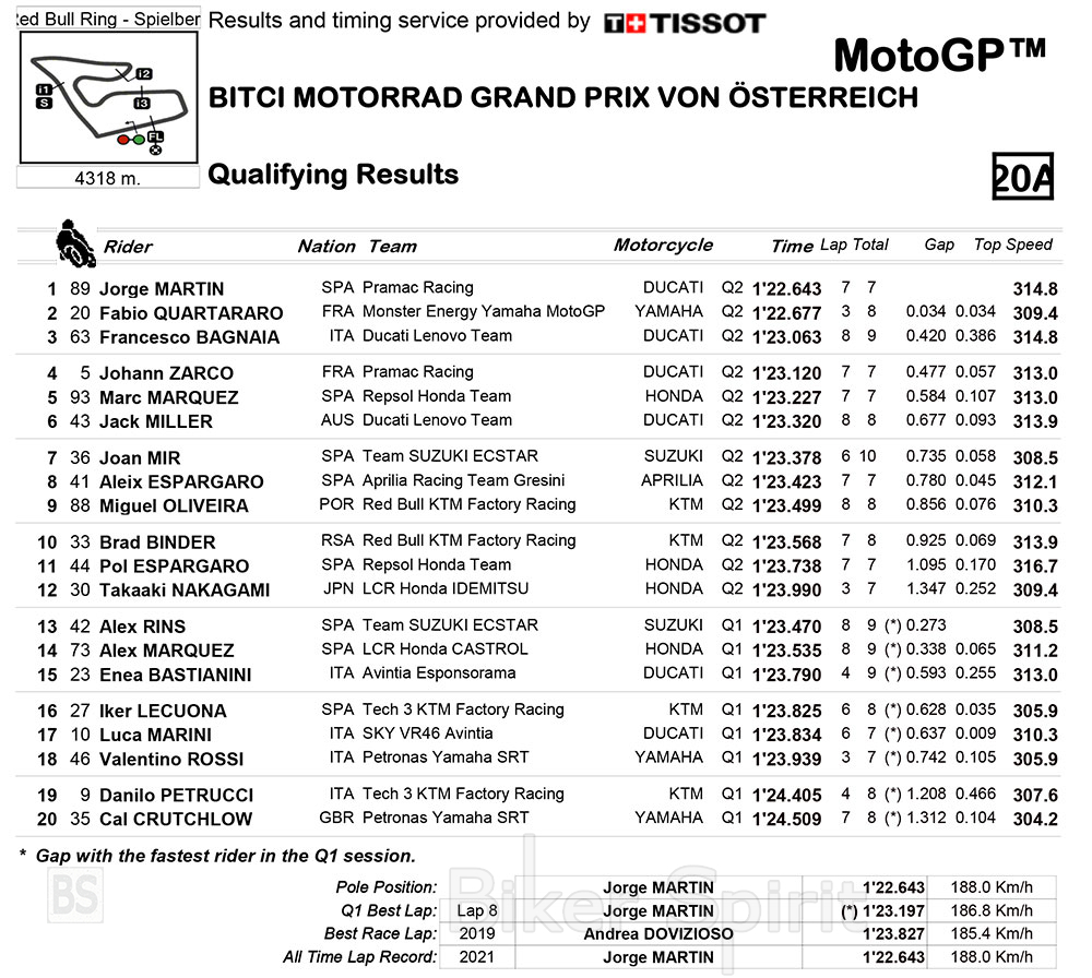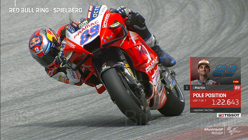 Ο Jorge Martin “Martinator” που έπρεπε να περάσει από το Q1, με την δορυφορική Pramac Ducati κέρδισε την 3η του pole φέτος, σταματώντας το χρονόμετρο στο 1.22.643, κερδίζοντας την δεύτερη συνεχόμενη pole στο Red Bull Ring της Αυστρίας!