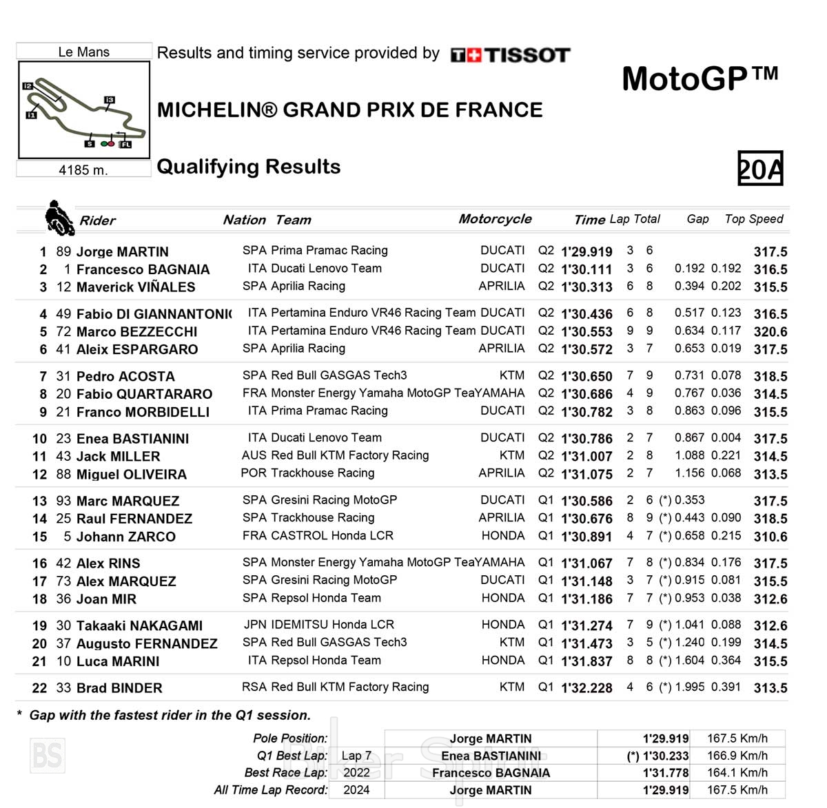 Από την τρίτη σειρά και την 7η θέση θα εκκινήσει ο πρωτάρης της KTM, Pedro Acosta, με χρόνο 1:30.650, μπροστά από το πρώτο Ιαπωνικό με τον Γάλλο Fabio Quartararo, που αγωνίζεται μέσα στο σπίτι του, ενώ την σειρά κλείνει ο Franco Morbidelli με το Ducati GP24.