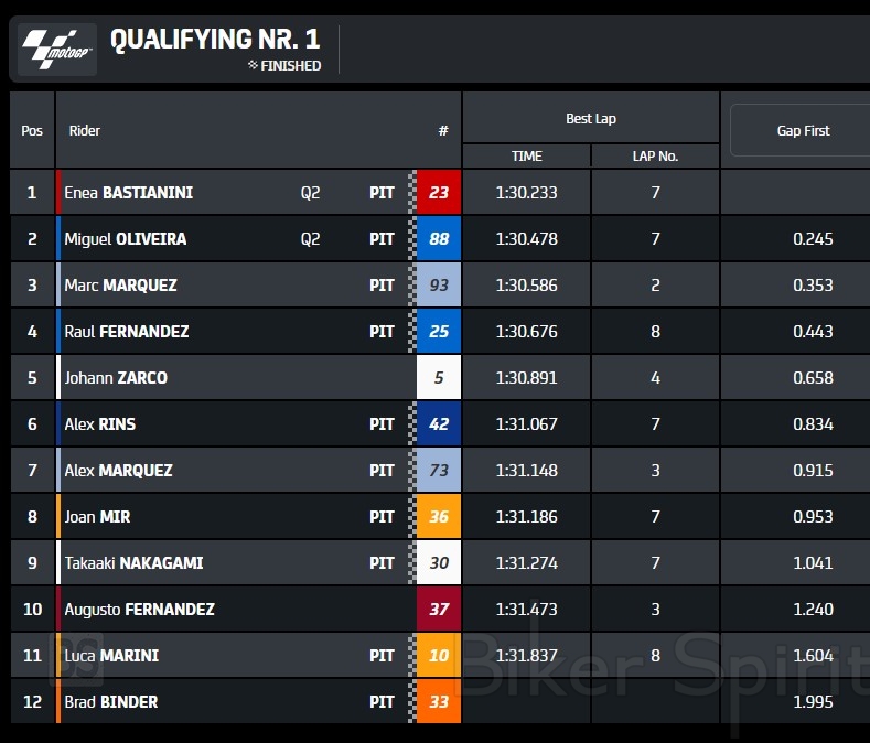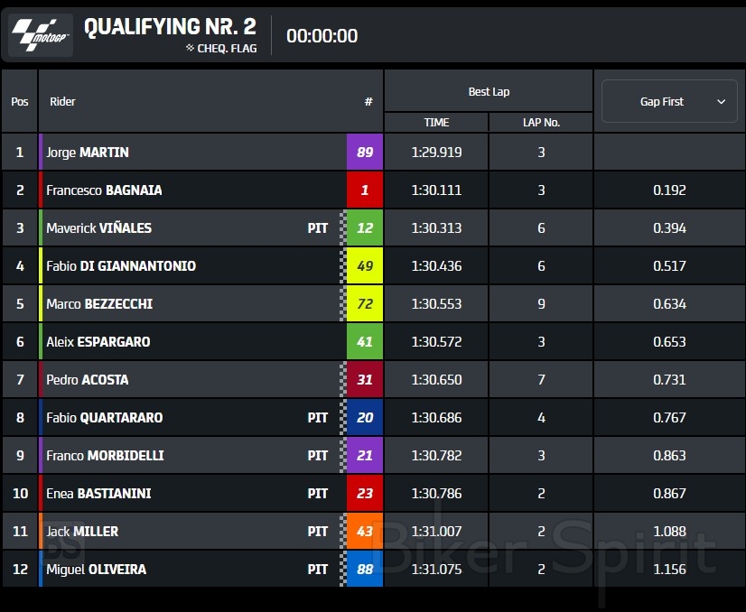 Στην δεύτερη θέση ο Pecco Bagnaia με το εργοστασιακό Ducati GP24 και με χρόνο 1:30.111, που είχε πτώση στον τελευταίο γρήγορο του γύρο, μπροστά από το πρώτο Aprilia Factory του Maverick Vinales με χρόνο 1:30.313 που κλείνει την πρώτη σειρά εκκίνησης!