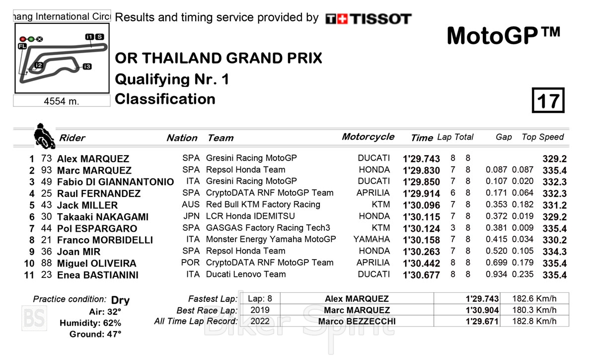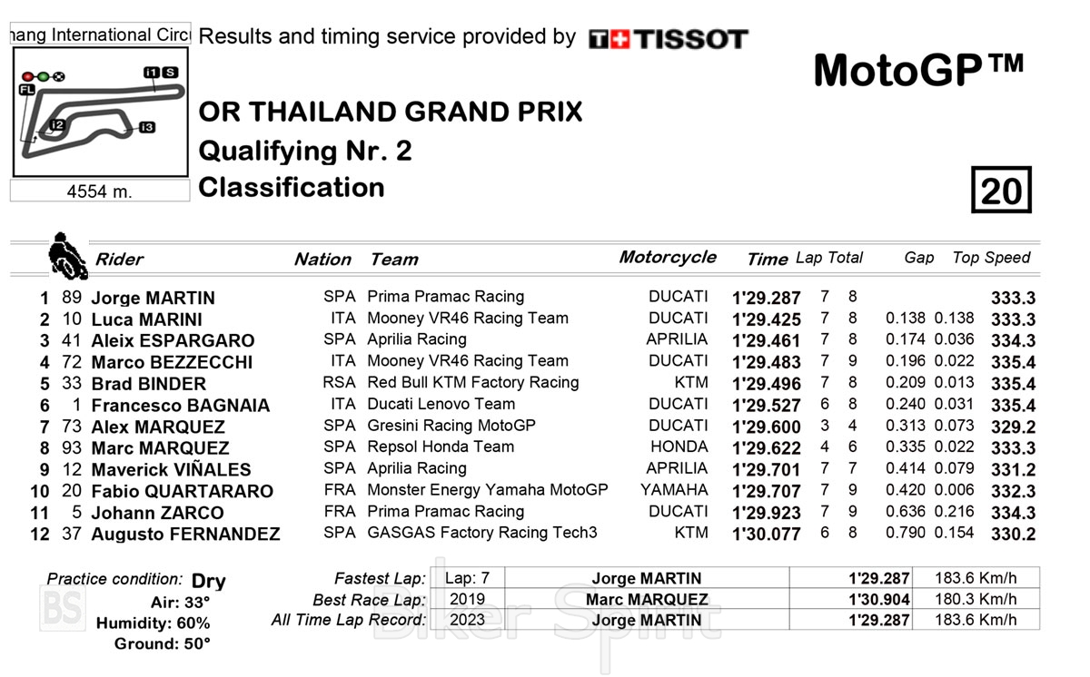 Στην δεύτερη θέση θα είναι ο Luca Marini με 0.138s διαφορά από τον πρώτο, ενώ την πρώτη σειρά θα κλείσει στην 3η θέση το πρώτο Aprilia με τον Aleix Espargarò και με διαφορά μόλις στα 0.174s.