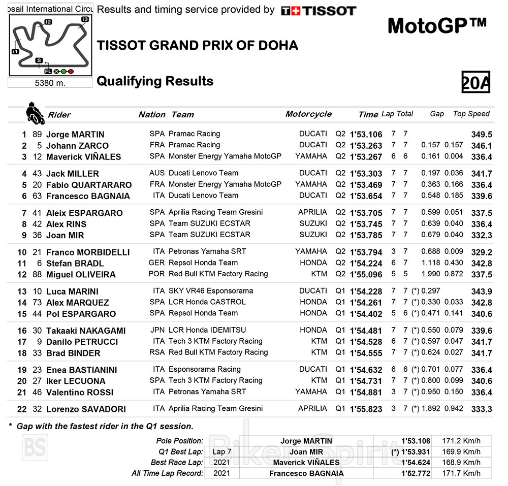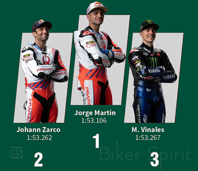 Στην πρώτη σειρά με το Martin θα εκκινήσει ο δεύτερος δορυφορικός οδηγός της Ducati Και ομόσταυλος του, Johan Zarco, με χρόνο 1.53.263 , με μόλις 0.157s διαφορά πίσω από τον πρώτο!