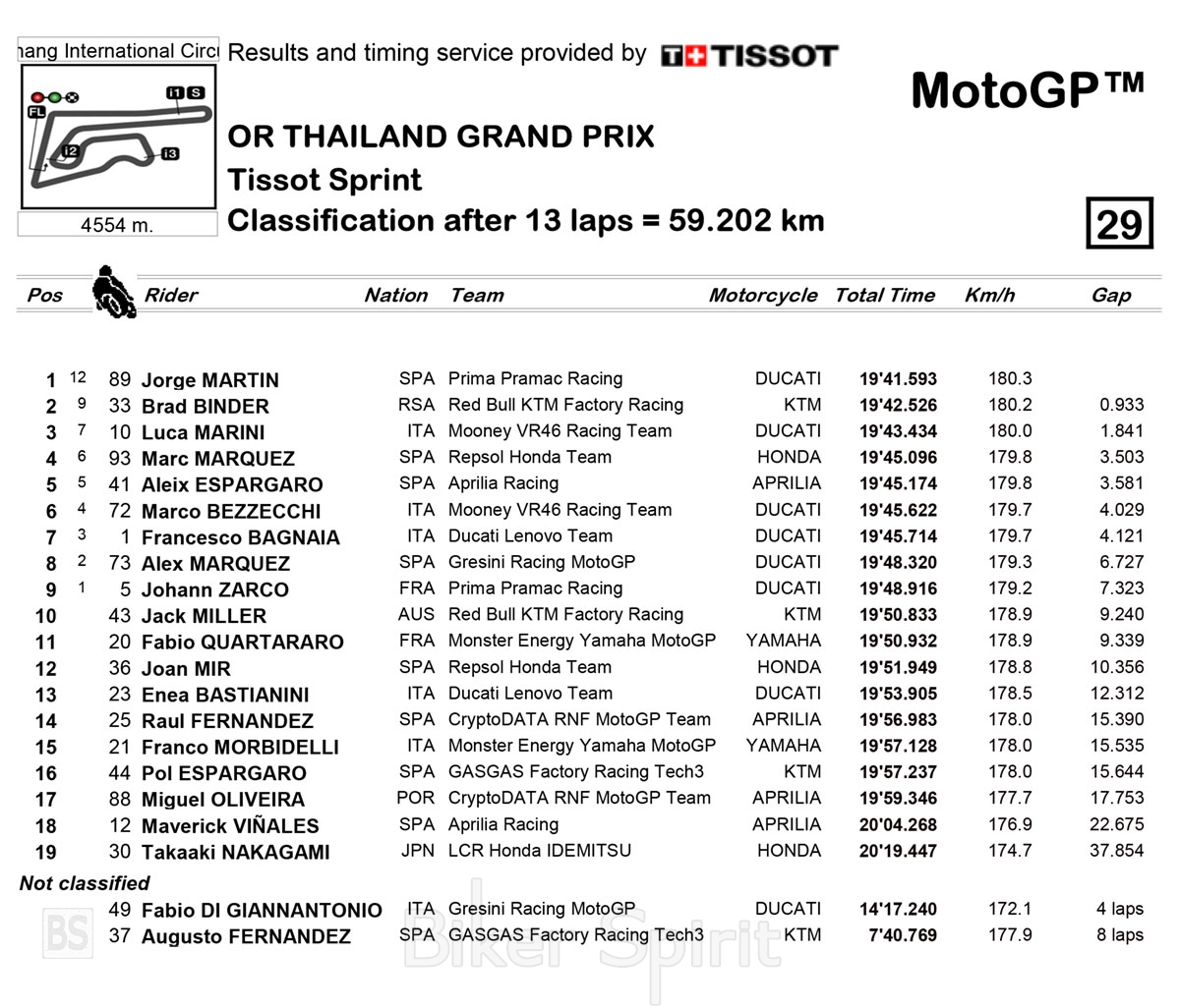 Ο Jorge Martin κέρδισε τον Αγώνα SPRINT στην Ταϊλάνδη – Binder και Marini στο βάθρο – Αποτελέσματα