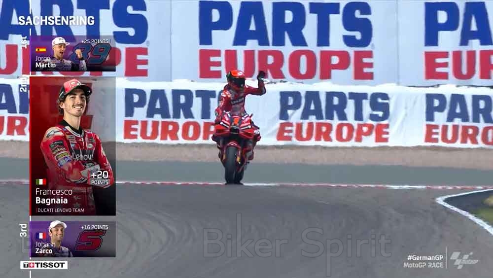 Στην 4η θέση τερμάτισε ο Marco Bezzecchi, μπροστά από τον ομόστυαλό του, Luca Marini, ενώ την 6αδα έκλεισε το KTM του Jack Miller, που μπήκε σφήνα στα 8 Ducati Που κυριολεκτικά κυριάρχησαν στο Sachsenring!