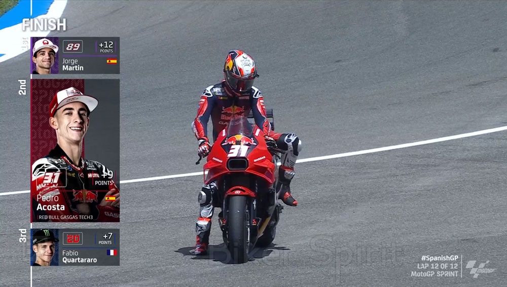 Στην 2η θέση τερμάτισε ο Pedro Acosta όταν ξαφνικά στον 7ο γύρο οι τρεις οδηγοί που ήταν μπροστά του, Alex Marquez, Brand Binder και Enea Bastianini βρέθηκαν ξαφνικά στο έδαφος στην ίδια στροφή χωρίς να ακουμπήσει κάνεις κανέναν!