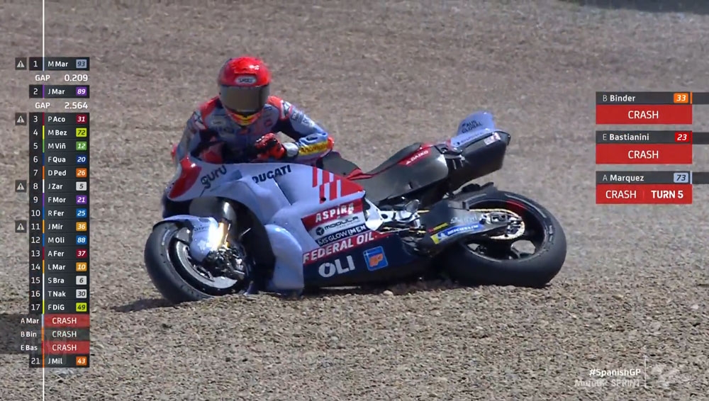 Πτώση είχε και ο Pecco Bagnaia, τα δυο εργοστασιακά Aprilia με τους Aleix Espargaro και Maverick Vinales, ο Marco Bezzecchi, Luca Marini, Stefan Bradl, και ο Jack Miller που συνέχισε τον αγώνα!