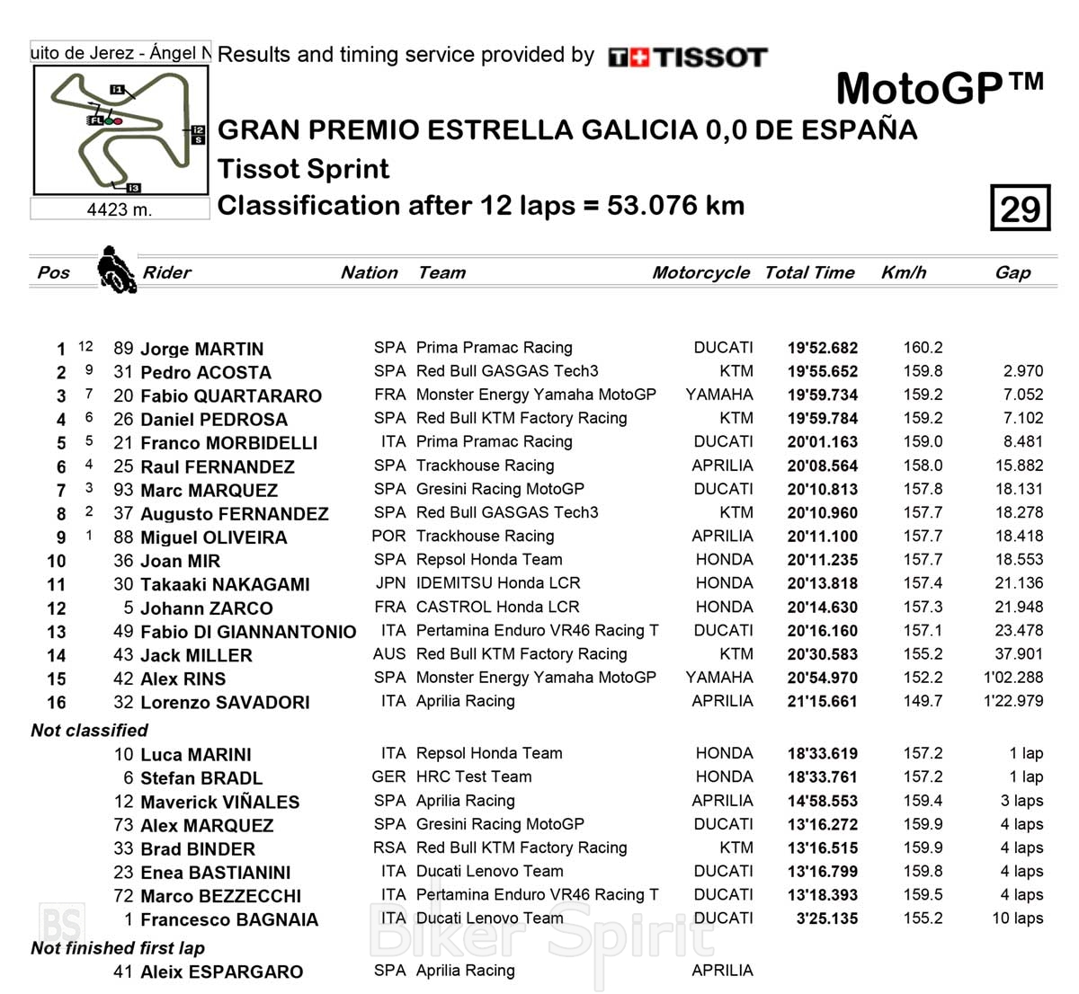 Στην 8η θέση τερμάτισε ο Agusto Fernandez με το GASGAS μπροστά από το δεύτερο Aprilia του Miguel Oliveira που έκλεισε και την 9αδα που παίρνει βαθμούς από αυτόν τον αγώνα Sprint.