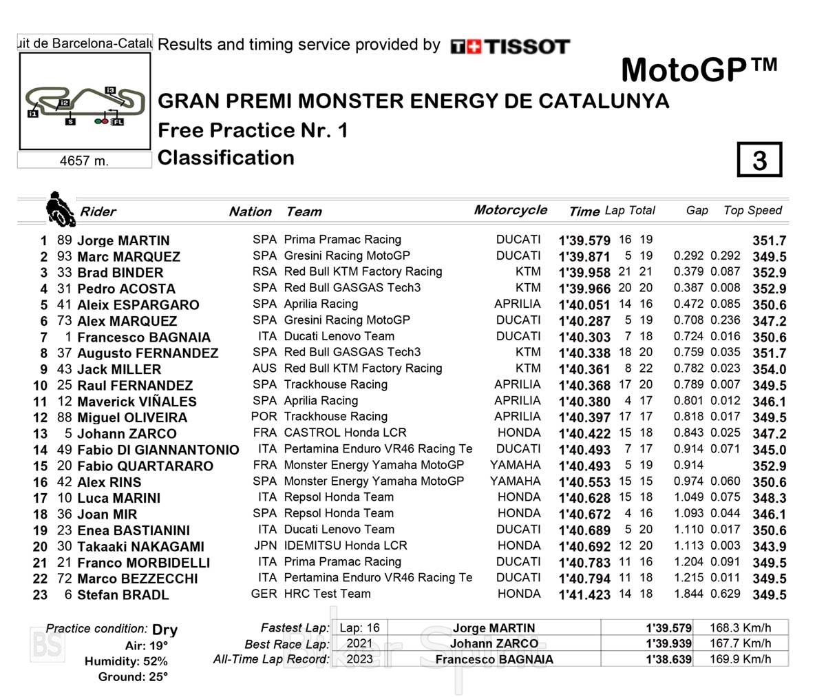 Ο Jorge Martin κυριάρχησε στα πρώτα ελεύθερα δοκιμαστικά FP1 MotoGP στην πίστα της Βαρκελώνης τα τελευταία λεπτά, αφού έβαλε καινούργια λάστιχα, μαλακά εμπρός και μεσαία πίσω. Ο αναβάτης της Team Ducati Pramac σημείωσε τον καλύτερο χρόνο με χρόνο 1:39.579, χρόνο που του επέτρεψε να είναι μπροστά από τον Marc Marquez για 0.292 δευτερόλεπτα.