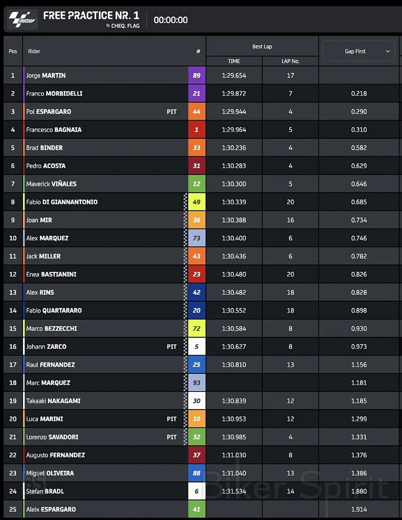 Ο Jorge Martin πέτυχε τον καλύτερο χρόνο, γράφοντας ένα γύρο με 1:29.654, με διαφορά 0.218 δευτ από τον συμπαίκτη του Franco Morbidelli.