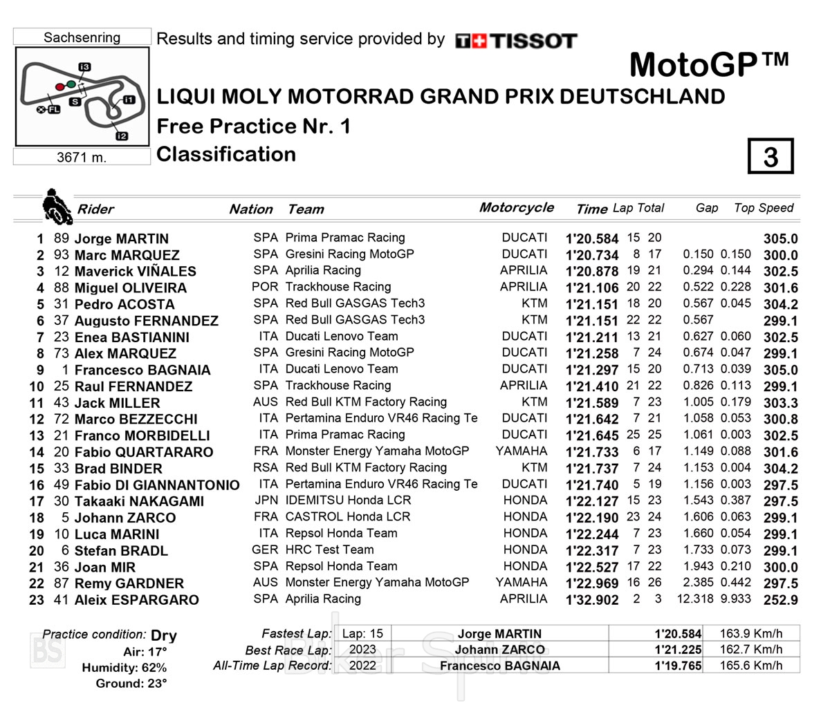 Ο οκτώ φορές παγκόσμιος πρωταθλητής, Marc Marquez με την Ducati GP23 της Gresini 1:20.734 που έκανε στην αρχή της συνεδρίας! Ο Marquez, είχε μια πτώση χωρίς συνέπειες στη στροφή 1 στο τέλος της συνεδρίας.