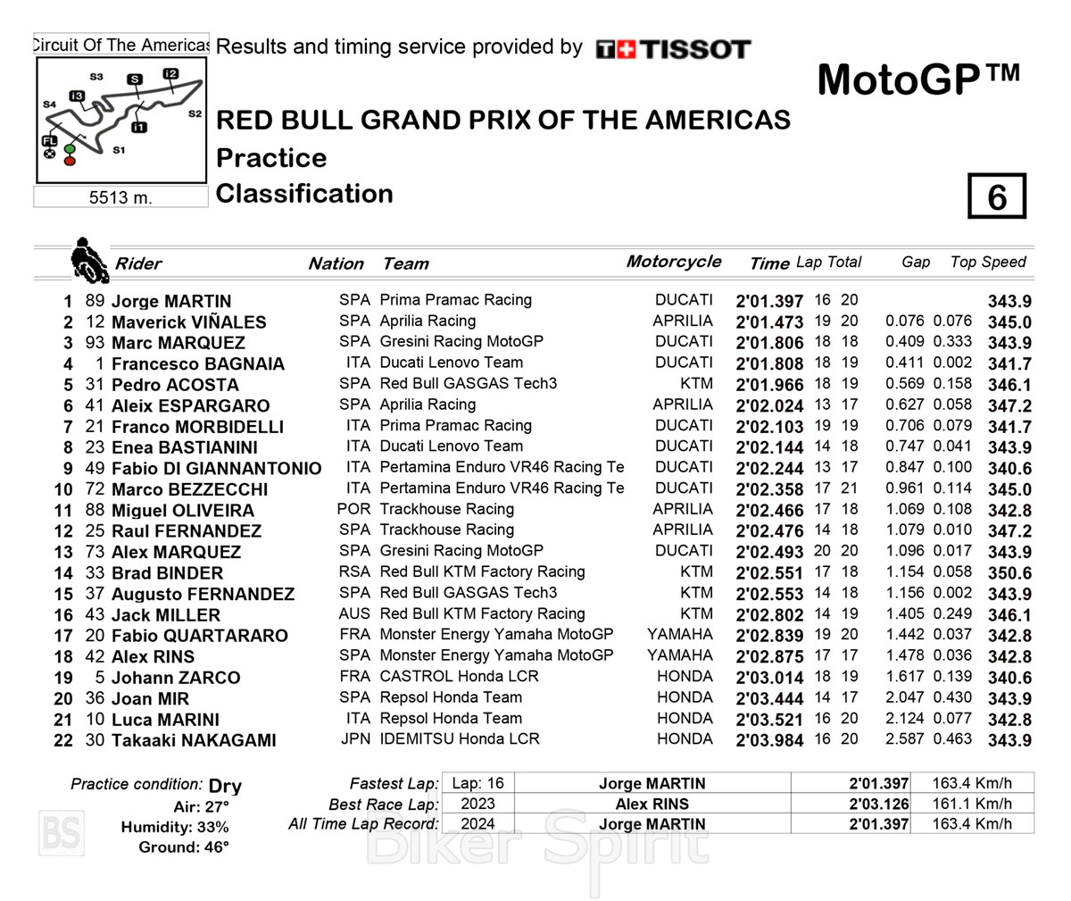 Την πρώτη εξάδα συμπλήρωσε το Aprilia RS-GP 24 του Aleix Espargarò, με χρόνο 2’02.024.