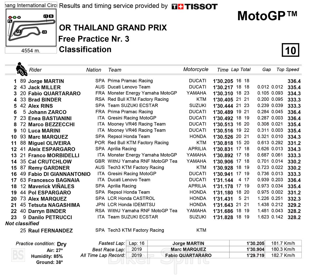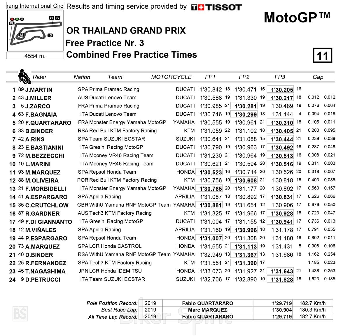Ο καλύτερος χρόνος ήταν αυτός του Jorge Martin, ο οποίος με τους Desmosedici της Team Pramac έκανε τον καλύτερο γύρο με 1: 30.205. Πίσω από τον # 89 τέλειωσε το εργοστασιακό Ducati με τον Αυστραλό Jack Miller, νικητή την περασμένη Κυριακή στο Motegi που είχε πτώση χωρίς συνέπειες στο τέλος της συνεδρίας.