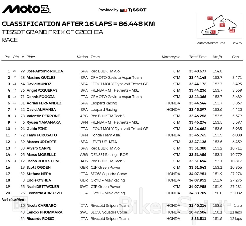 Στον απαιτητικό αγώνα του Brno, ο Jose Antonio Rueda της Red Bull KTM Ajo οδήγησε με μαεστρία και κυριάρχησε, αφήνοντας πίσω του κάθε αντίπαλο και κατακτώντας μια καθαρή νίκη με χρόνο 33:40.677.