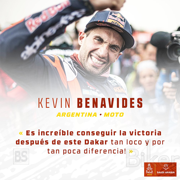 Ο Kevin Benavides είναι πλέον και επίσημα δύο φορές πρωταθλητής του Dakar. Ο Αργεντινός κατάκτησε τον τίτλο κερδίζοντας την τελευταία ειδική, με προβάδισμα πενήντα πέντε δευτερολέπτων.