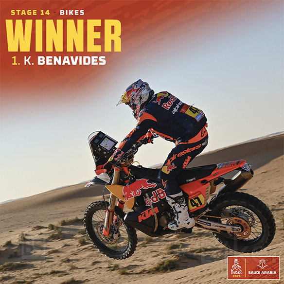 Ο Benavides ήταν πρώτος καθ’ όλη τη διάρκεια της ημέρας και στο τέλος ανακηρύχθηκε νικητής της τελευταίας ειδικής αλλά και του Rally Dakar 2023, με διαφορά 55 δευτερολέπτων από τον κύριο αντίπαλό του, Τoby Price. Ο Pablo Quintanilla τερμάτισε στην τρίτη θέση, με περισσότερα από τρία λεπτά διαφορά σε σχέση με τον νικητή.