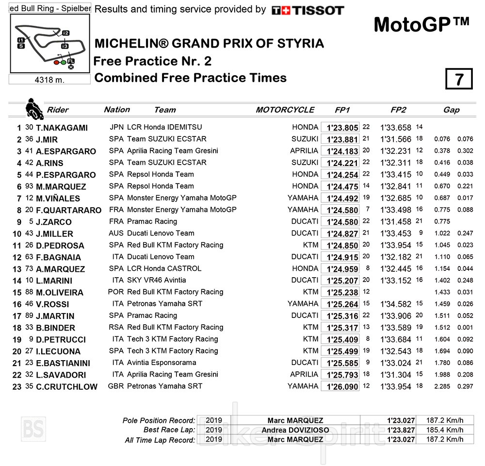 Έτσι οι χρόνοι από το FP1 είναι αυτοί που καθορίζουν την προσωρινή άμεση πρόσβαση στο Q2 και η δεκάδα είναι η εξής:: Nakagami, Mir, Aleix Espargarò, Rins, Pol Espargarò, Marc Marquez, Vinales, Quartararo, Zarco και Miller.