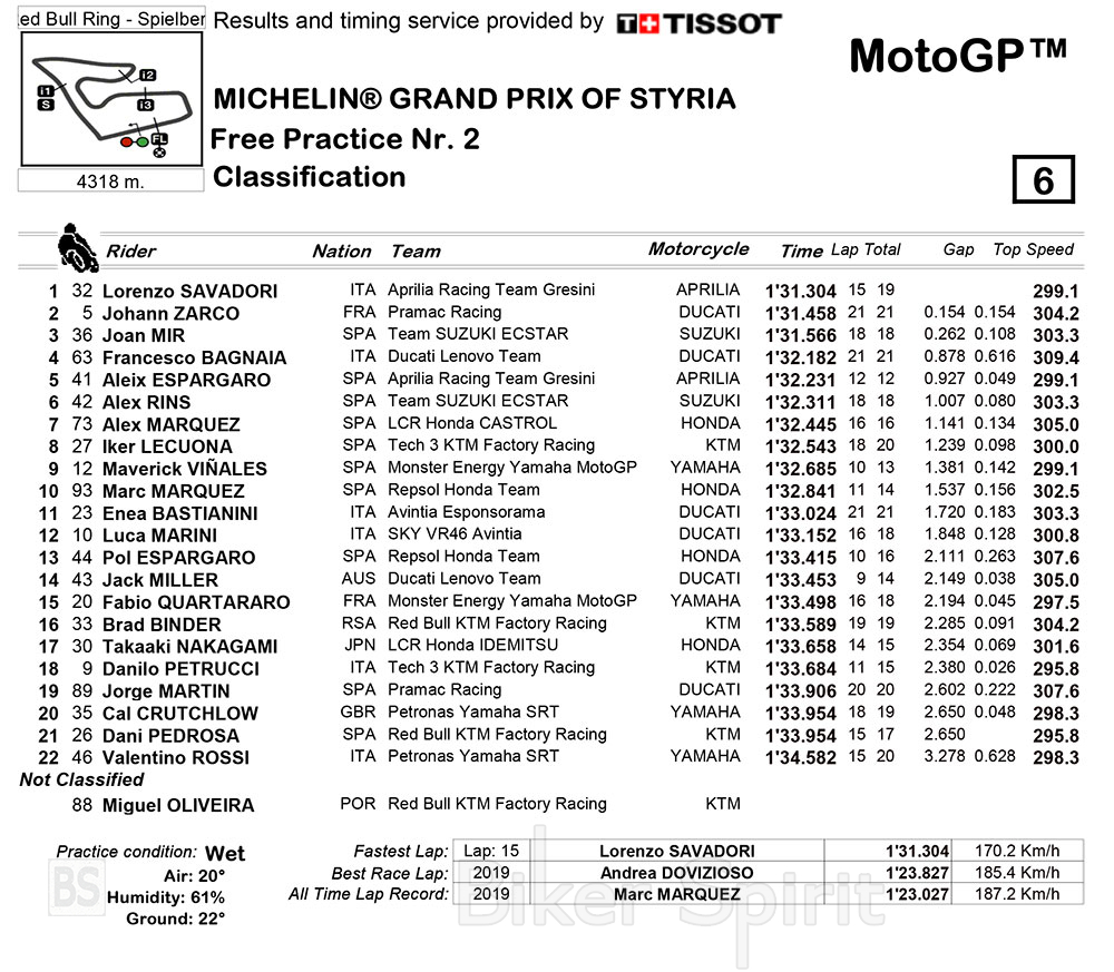 Ο Jack Miller που, όπως αναφέρθηκε, τόλμησε να χρησιμοποιήσει slicks στο τέλος της συνεδρίας τερμάτισε 14ος, μπροστά από τον Fabio Quartararo (Yamaha Factory).