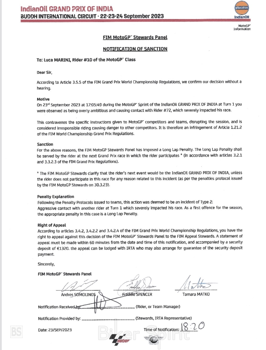 Οι αγωνοδίκες της FIM επέδωσαν αργότερα στον Marini μια ποινή μεγάλου γύρου, (Long Lap Penalty) που θα εκτίσει στον επόμενο αγώνα MotoGP (Κυριακής) του Ιταλού, για «επιθετική επαφή με έναν άλλο αναβάτη στη στροφή 1 που επηρέασε σοβαρά τον αγώνα του».