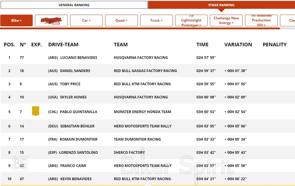 Το Top 10 της ημέρας έκλεισαν οι R. Dumontier (Husqvarna), με +5:34 στην 7η θέση, μπροστά από τον L. Santolino (Sherco), με +5:43, τον F. Caimi (Hero), με +5:58 και τον K. Benavides (KTM), με +6:22.