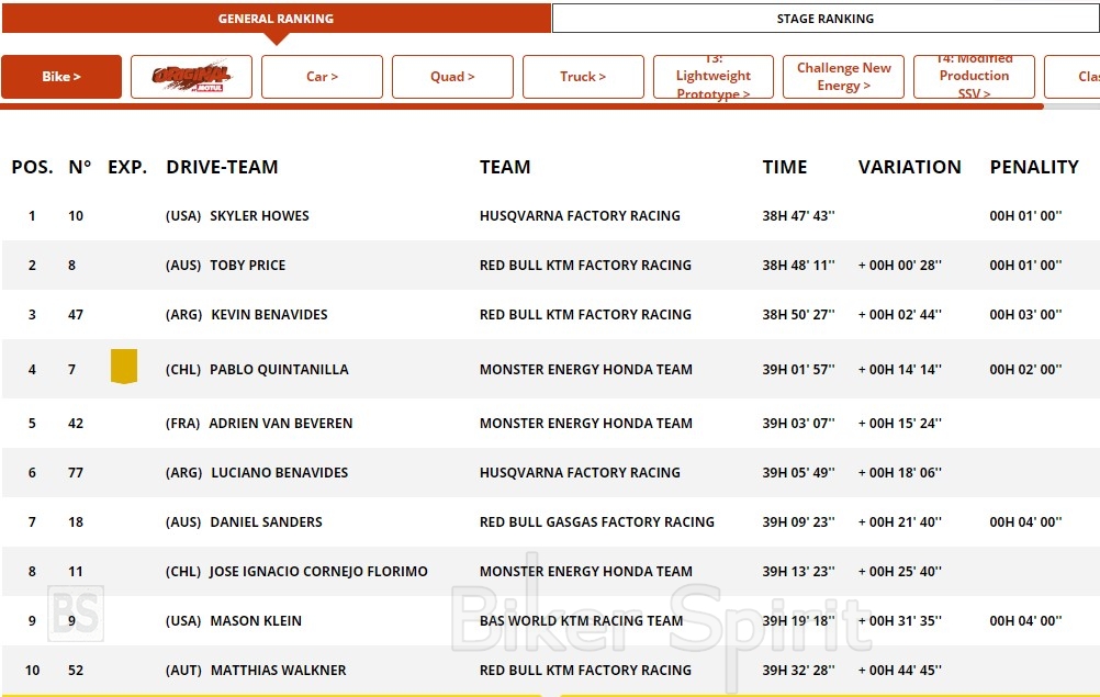 Στη γενική κατάταξη, ο Howes προηγείται μπροστά από τα 2 ποδήλατα KTM. Ο Toby Price είναι μόλις 28” πίσω και ο Kevin Benavides ακολουθεί τα μονοπάτια κατά 2’44”. Τα Honda που οδηγούν οι Pablo Quintanilla και Adrien Van Beveren είναι αρκετά μακριά από το βάθρο, αντίστοιχα 15 λεπτά πίσω.