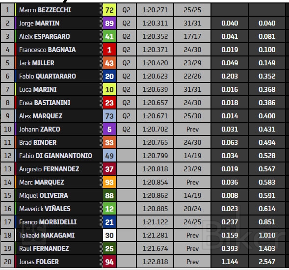 Στα τελευταία λεπτά έγινε μια πραγματική μάχη με τους χρόνους να κοκκινίζουν σε κάθε τομέα αλλα ήταν ο Marco Bezzecchi που πηρέ την πρώτη θέση με την Ducati και με χρόνο 1:20.271.