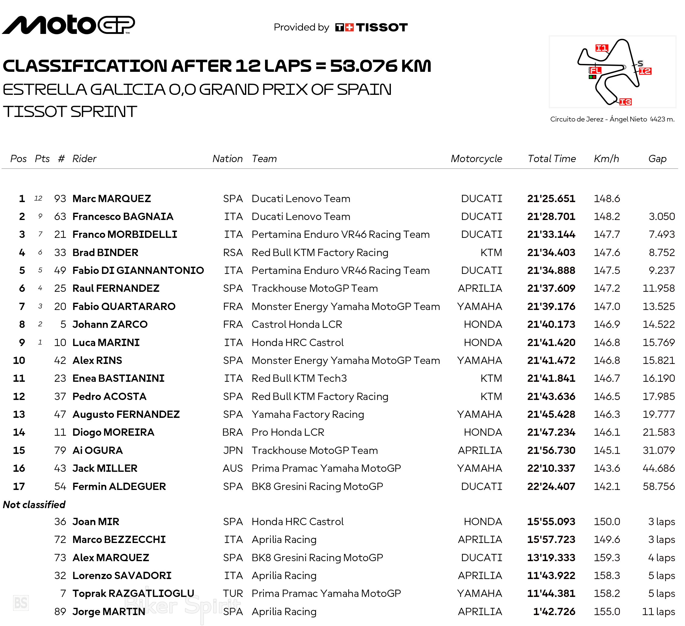 Ο Marc Marquez κέρδισε το Sprint στη Jerez, σε αγώνα με συνεχείς αλλαγές συνθηκών και αποφάσεις που έκριναν το αποτέλεσμα. Δεύτερος τερμάτισε ο Pecco Bagnaia και τρίτος ο Franco Morbidelli.