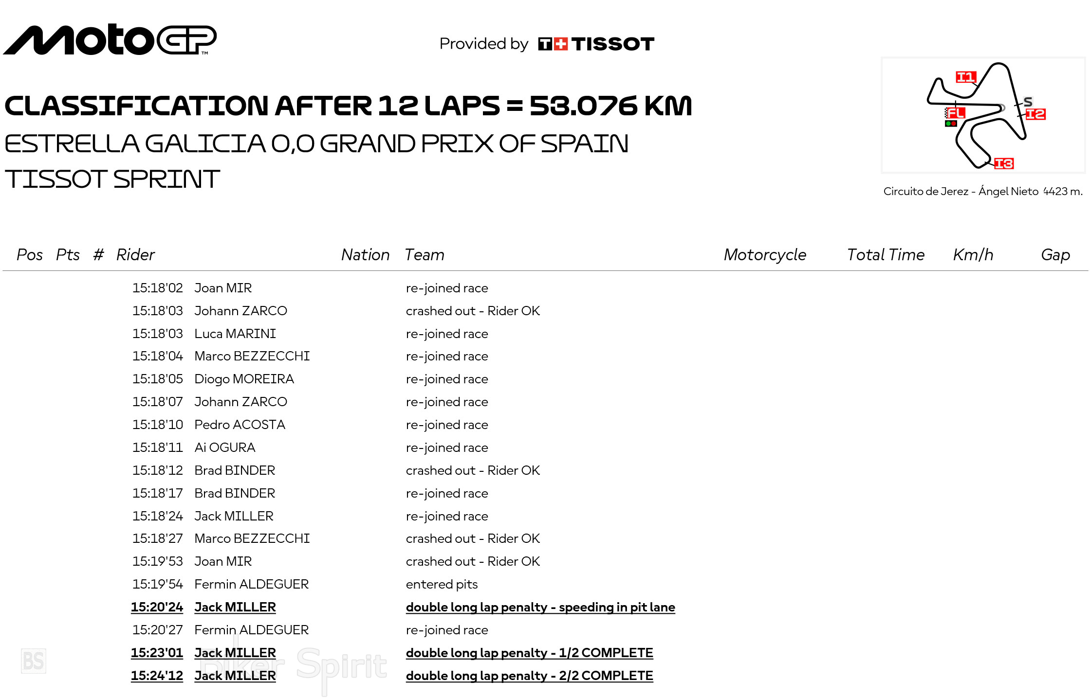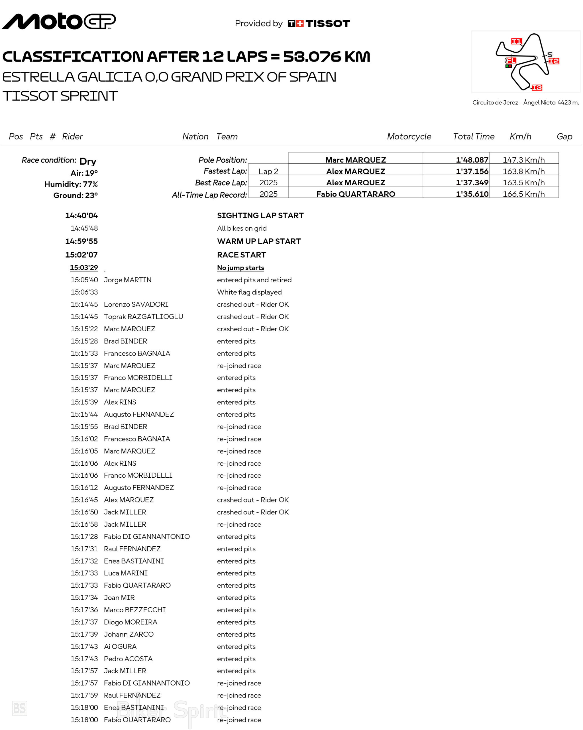 Ο Alex Marquez και ο Jack Miller είχαν επίσης πτώση, ενώ ο Fabio Di Giannantonio βρέθηκε προσωρινά στην κορυφή πριν μπει στα pits.