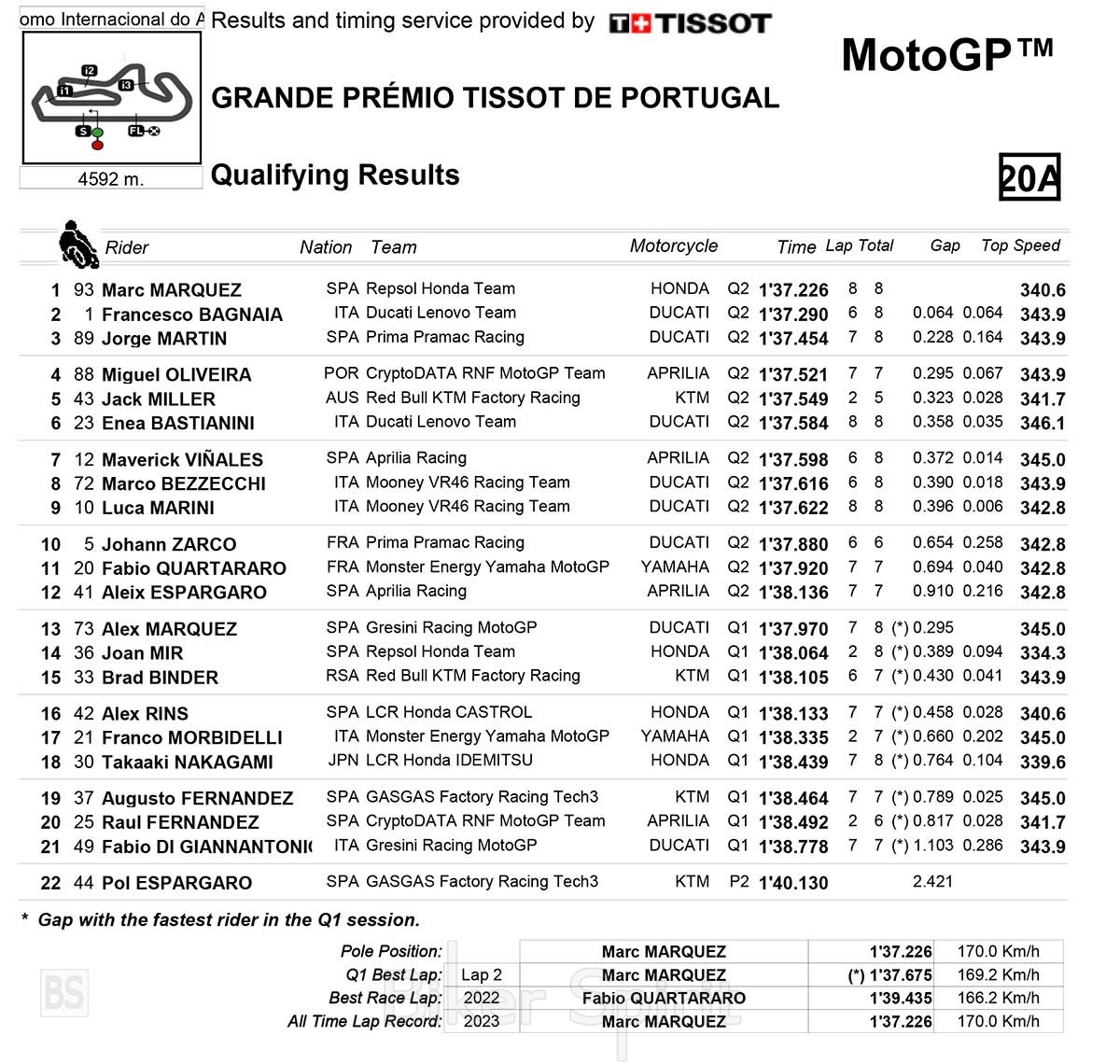 Από την δεύτερη θέση θα εκκινήσει ο Pecco Bagnaia που σημείωσε χρόνο 1.37.290 και διαφορά μόλις 0.064, ενώ την πρώτη σειρά συμπλήρωσε ο Jorge Martin με χρόνο 1.37.454