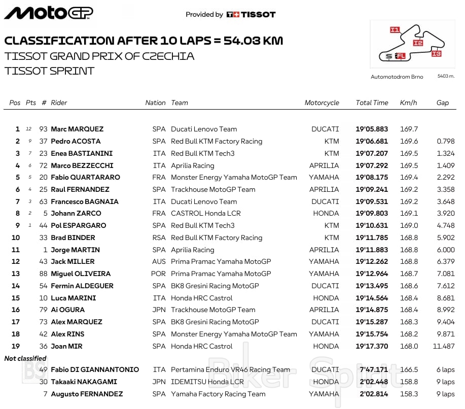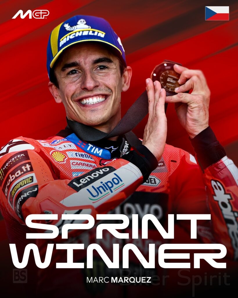 Ο Marc Marquez νίκησε τον αγώνα Sprint και βρίσκεται υπό έρευνα για προβλήματα πίεσης ελαστικών, με την εξέλιξη αυτή να ρίχνει σκιές πάνω από την εξαιρετική του επίδοση στο Brno.Ο Ισπανός αναβάτης, παρά την έρευνα γύρω από την πίεση των ελαστικών του, σημείωσε την 11η νίκη του σε 12 αγώνες φέτος, με τον Acosta να τερματίζει δεύτερος και τον Bastianini να διατηρεί την τρίτη θέση. Αξιοσημείωτο ήταν το πέρασμα του Raul Fernandez στον Bagnaia στην τελευταία στροφή, με τον Ιταλό να καταλαμβάνει τελικά την 7η θέση.