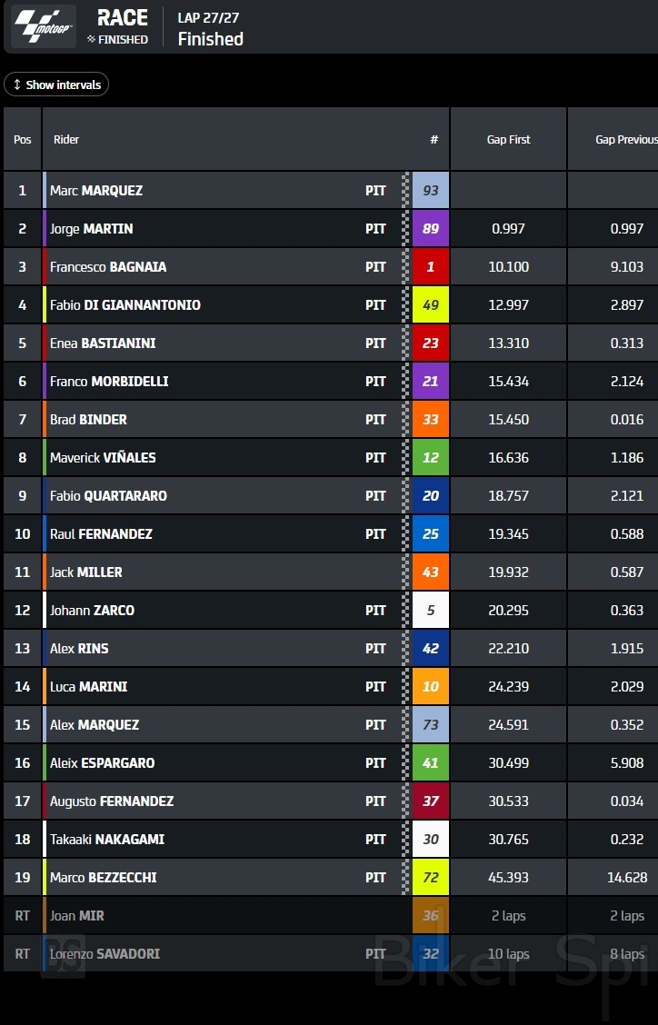 Στην 1η θέση τερμάτισε ο Marc Márquez, με το Ducati GP23 της Gresini, που έκανε μια εντελώς χάλια εκκίνηση σπινάροντας φοβερά και χάνοντας πάρα πολλές θέσεις και απο οτι φάνηκε ηταν απο ατυχία οπως μπορείτε να δείτε παρακάτω στο βιντεο . Γρήγορα πριν ακόμα τελειώσει ο πρώτος γύρος βρέθηκε την 6η θέση και άρχισε να προσπερνά και πάλι τους πάντες φτάνοντας μέχρι την 2η θέση. Από εκεί και πέρα έδωσε μια φοβερή μάχη με τον Martin, επικρατώντας τελικά, κάνοντας την 3η του νίκη για φέτος, και την 62η στο MotoGP και την 88η στην καριέρα του!