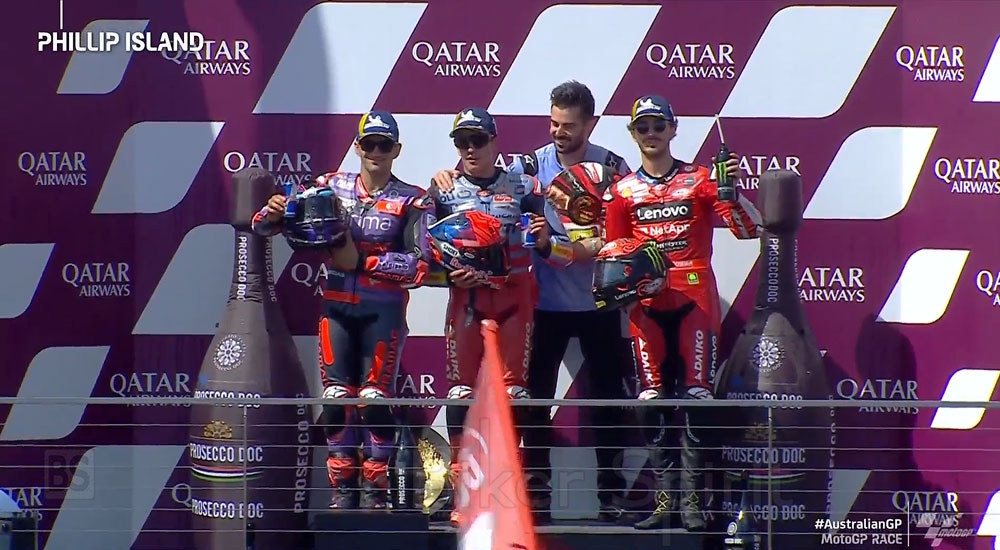 Το βάθρο του αγώνα έκλεισε η εργοστασιακή Ducati GP24 του Pecco Bagnaia οπού έκανε μια εκπληκτική εκκίνηση από την δεύτερη σειρά και βρέθηκε στην 3η θέση για τους πρώτους γύρους αλλα δεν άντεξε στις επιθέσεις του Marquez και έτσι έμεινε στην 3η θέση.