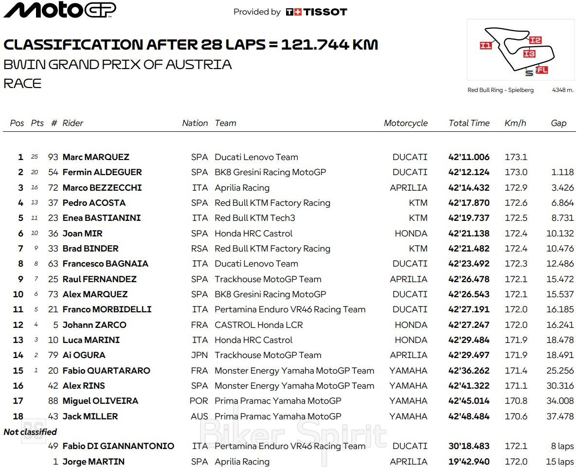 Ο Marquez δείχνει ασταμάτητος και με αυτή τη νίκη ενισχύει ακόμα περισσότερο την παρουσία του στη μάχη του τίτλου, ενώ ο Aldeguer κέρδισε τις εντυπώσεις με μία εμφάνιση που θα συζητηθεί πολύ.