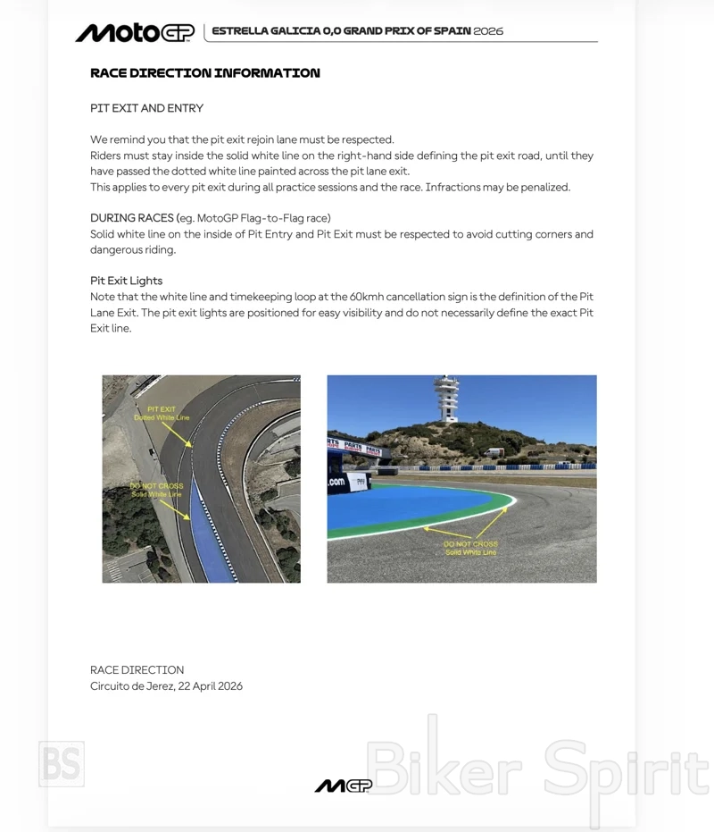 Οι αναβάτες πρέπει να παραμένουν μέσα στη συνεχή λευκή γραμμή στη δεξιά πλευρά, η οποία ορίζει τη διαδρομή εξόδου των pits, μέχρι να περάσουν τη διακεκομμένη λευκή γραμμή που βρίσκεται ζωγραφισμένη εγκάρσια στο τέλος της εξόδου.