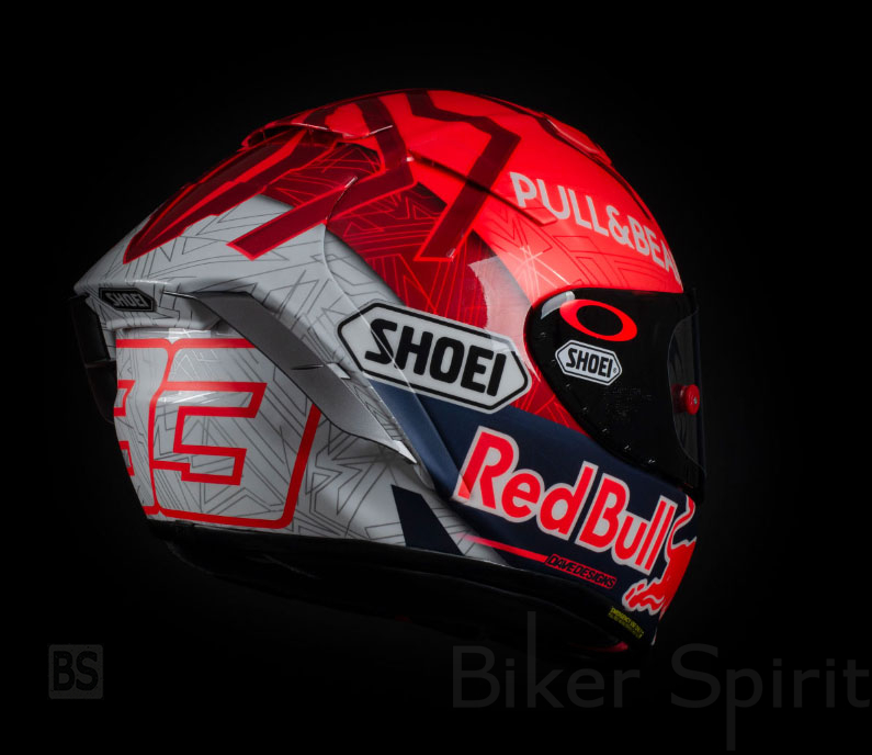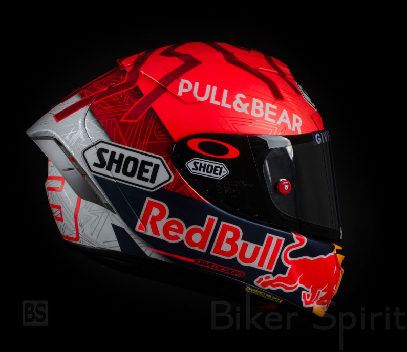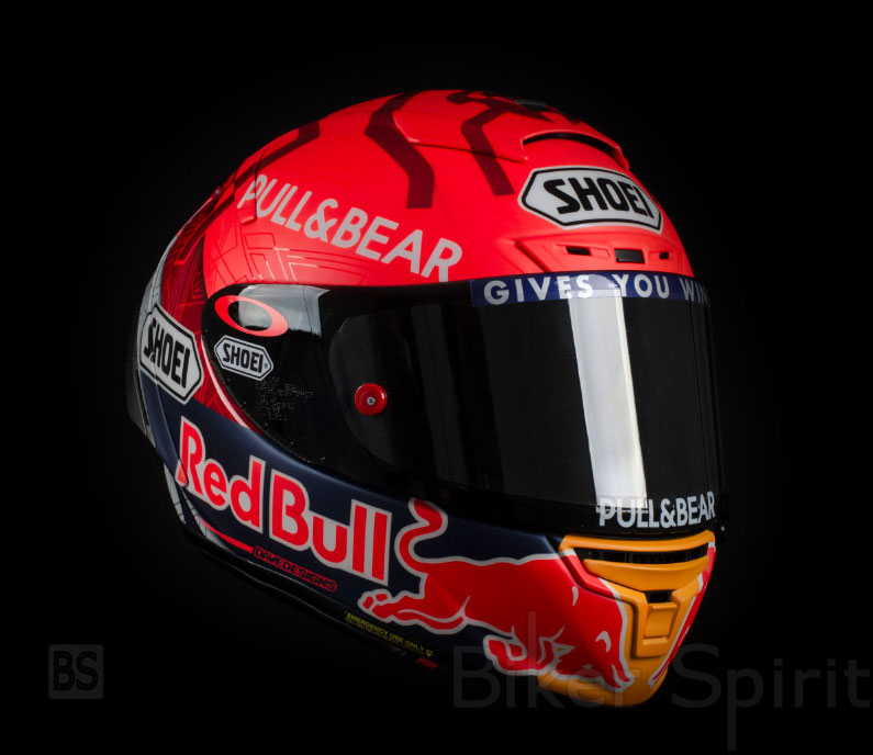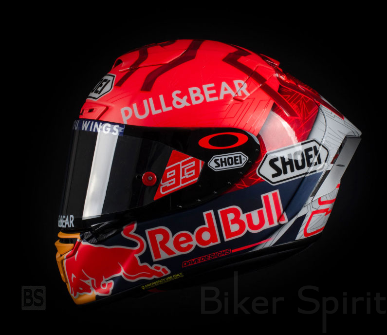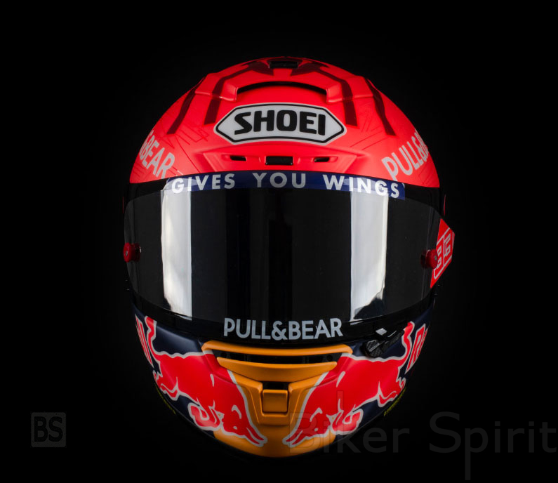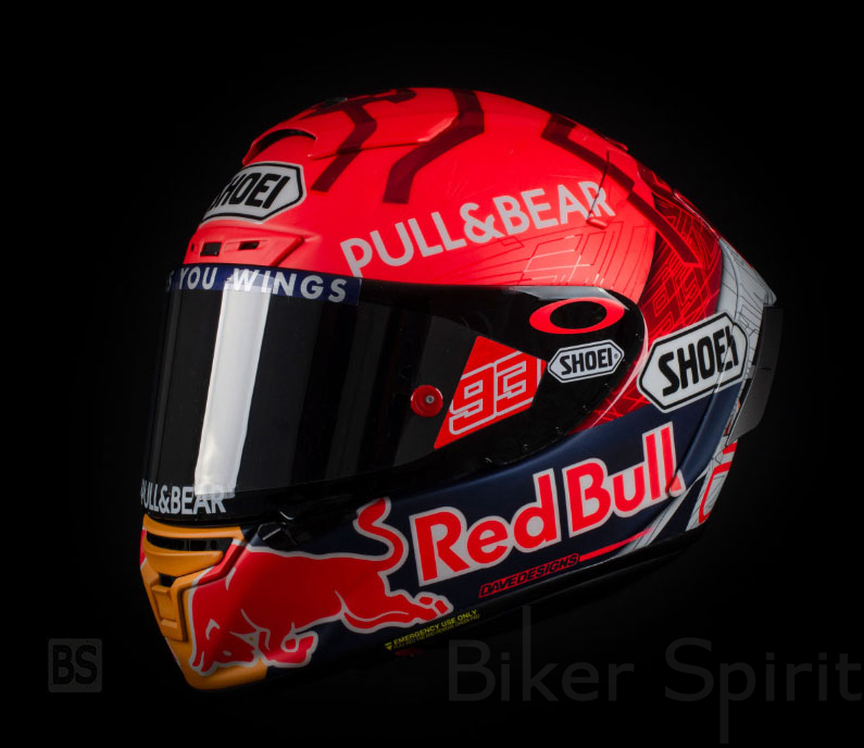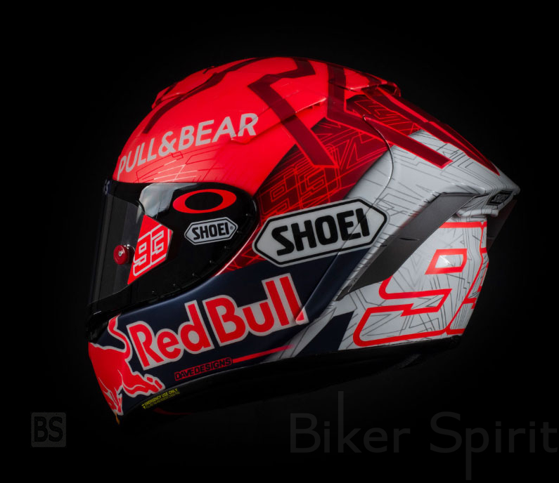 Το κράνος Shoei είναι κόκκινο στο πάνω μέρος και φαίνεται το σχέδιο του μυρμηγκιού, εκτός από το λογότυπο του χορηγού του Pull & Bear. Στο κάτω μέρος υπάρχει η επωνυμία της Red Bull με τα κλασικά χρώματα κίτρινο, μπλε, κόκκινο και λευκό. Πίσω έχει ένα μεγάλο μέρος σε λευκό με τον αριθμό 93, με περίγραμμα σε κόκκινο χρώμα.