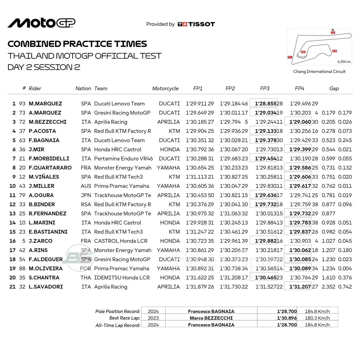 Το επίτιμο «βάθρο» της ημέρας έκλεισε στην 3η θέση το πρώτο Aprilia με τον Marco Bezzecchi, με χρόνο στο 1,29,060 και διαφορά από την κορυφη στα +0.250s.