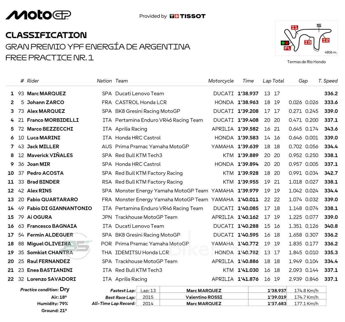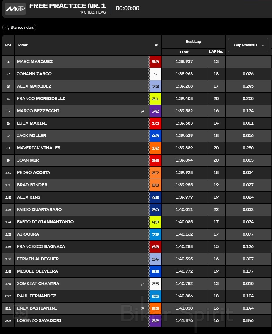 Στην 11η θέση ο Brad Binder, μπροστά από τα Factory Yamaha των Alex Rins και Fabio Quartararo και της VR46 Racing Team Ducati του Fabio di Giannantonio. Ο πρωτάρης της Aprilia, Ai Ogura (Trackhouse Racing) κλείνει την 15αδα, μπροστά από τον Pecco Bagnaia που έκλεισε το FP1 με περισσότερο από ένα δευτερόλεπτο πίσω από τον συμπαίκτη του Marc Marquez, ακριβώς 1.351 δευτερόλεπτα.