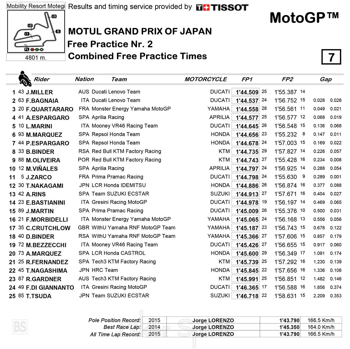 Στην δεύτερη θέση και με διαφορά μόλις 0,144 δευτερόλεπτα, τέλειωσε το FP2, η Ducati Pramac του Jorge Martin, ενώ την πρώτη τριάδα συμπλήρωσε με μόλις 11 χιλιοστά διαφορά από τον δεύτερο η εργοστασιακή Ducati του Jack Miller.
