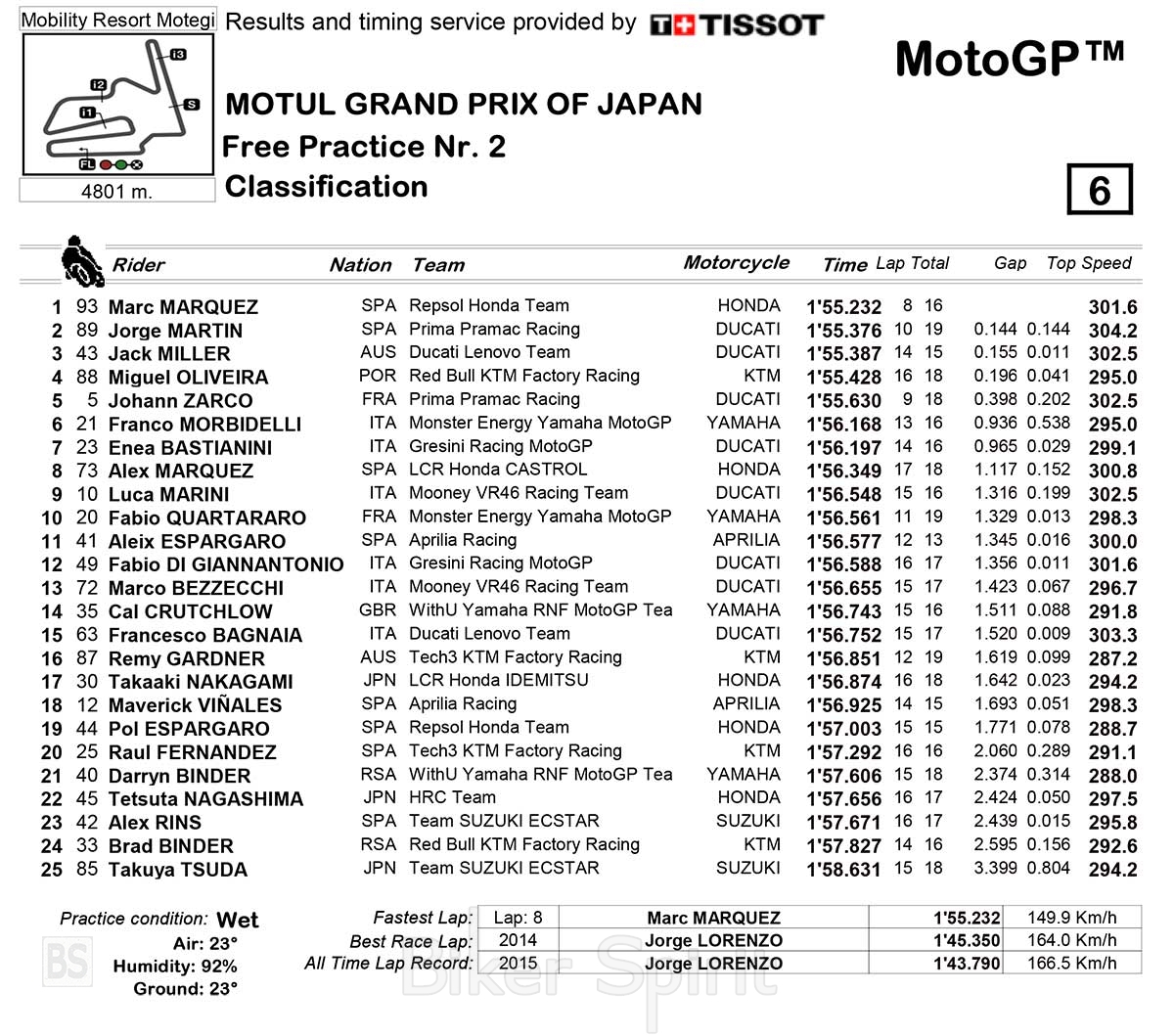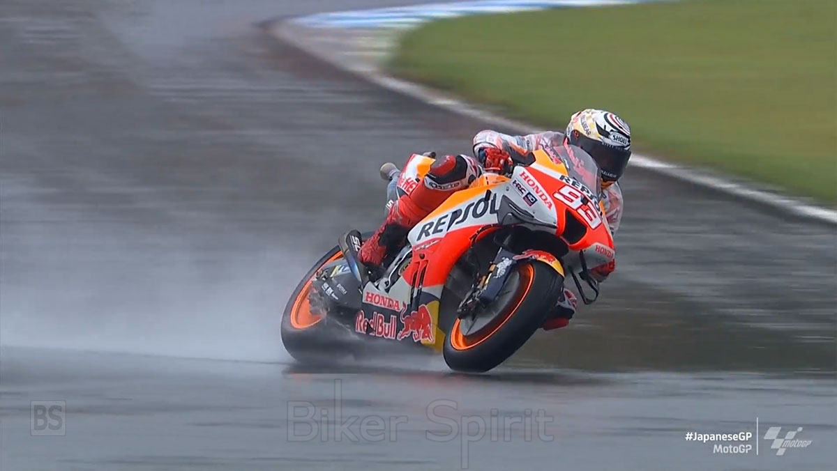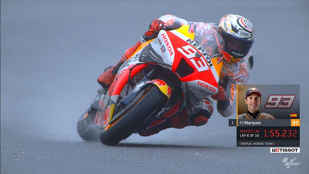 Οδηγώντας με δυνατή βροχή σε αυτό το FP session με ελαστικά βροχής, ο ταχύτερος οδηγός ήταν ο Marc Marquez που έφερε την Honda στην κορυφη σταματώντας το χρονόμετρο στο 1:55.232.