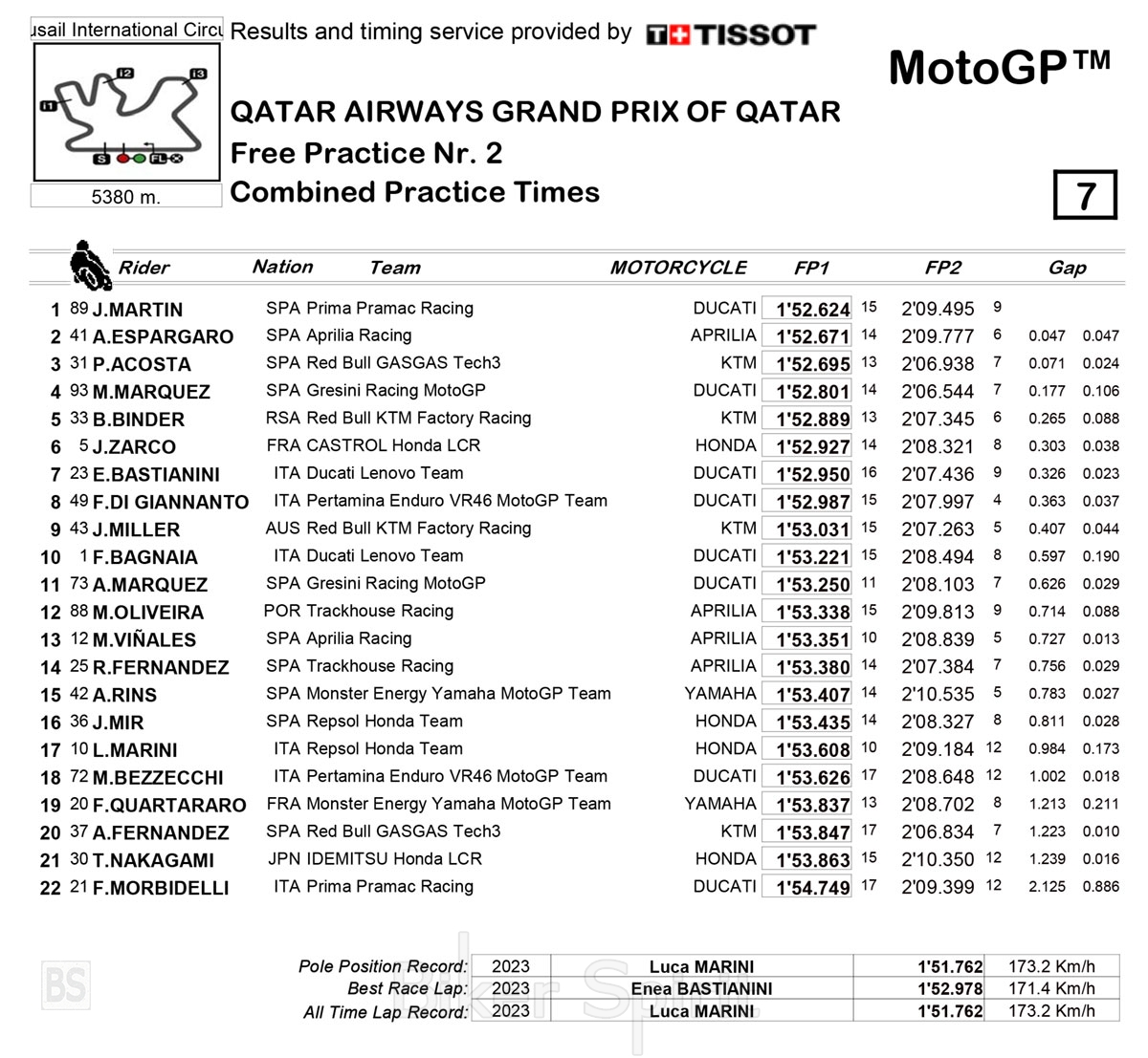 Ακολουθήσαν τα δυο ΚΤΜ της KTM Factory με τους Jack Miller και Brand Binder, στην 4η και 5η θέση, ενώ την εξάδα συμπλήρωσε το δορυφορικό Aprilia με τον Raul Fernández.