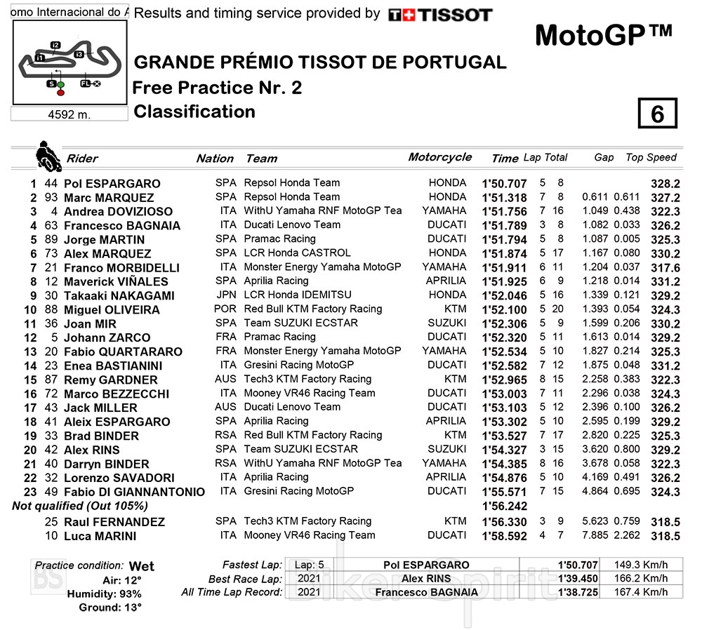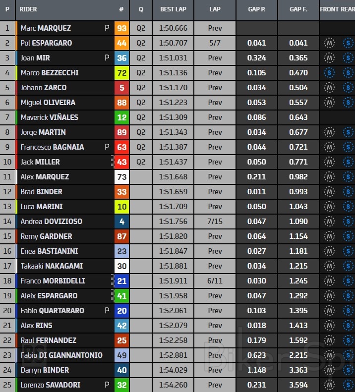 Οι οδηγοί που μετα τα συνδυασμένα χρονομετρημένα FP1 και FP2 περνούν στο προσωρινό Q2 είναι : Marc Marquez, Pol Espargarò, Joan Mir, Marco Bezzecchi, Johann Zarco, Miguel Oliveira, Maverick Vinales, Jorge Martin, Pecco Bagnaia και Jack Miller.