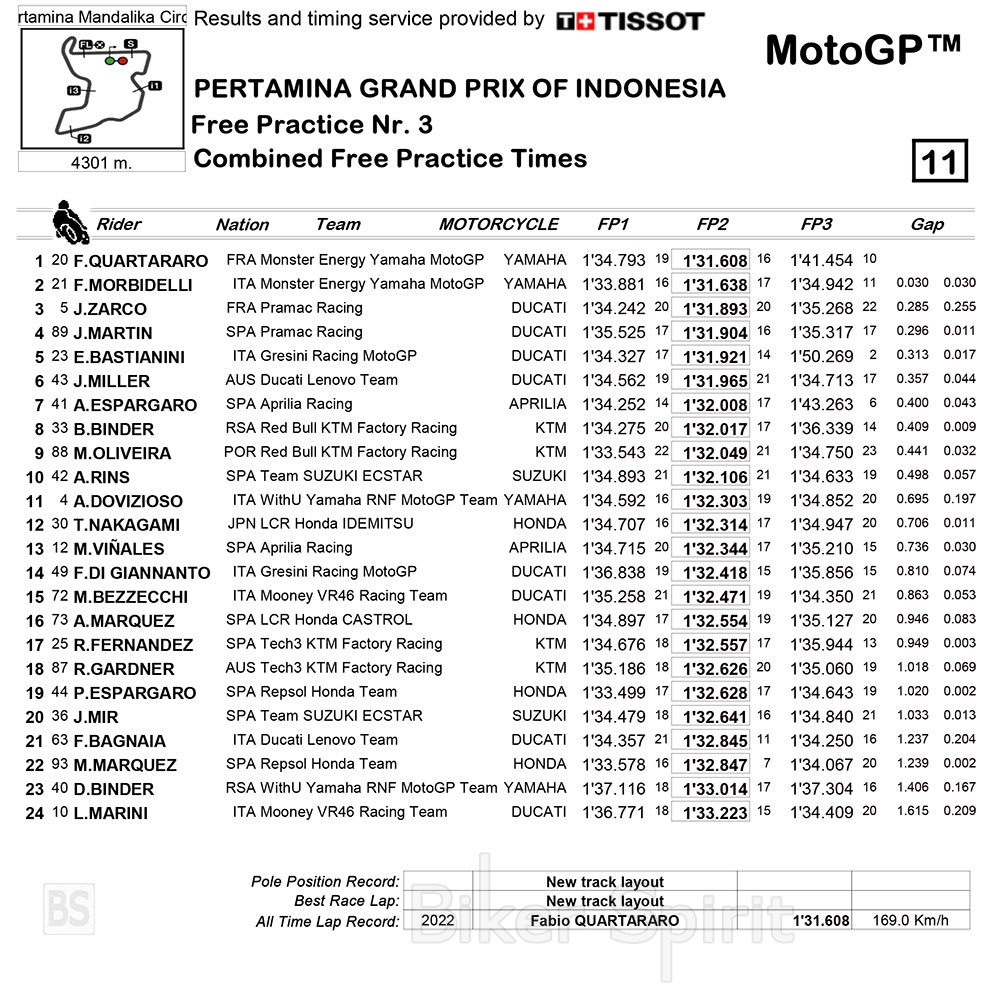 Με χρόνο 1.34.067, ο Marc Marquez ήταν ο κορυφαίος του FP3, μπροστά από τρία Ducati των Francesco Bagnaia, με χρόνο 1.34.250, Marco Bezzecchi και Luca Marini, που όλοι όμως θα αναγκαστούν να περάσουν από το Q1, αφού στα συνδυασμένα αποτελέσματα είναι στην 22η , 21η , 15η και 24η θέση αντίστοιχα!