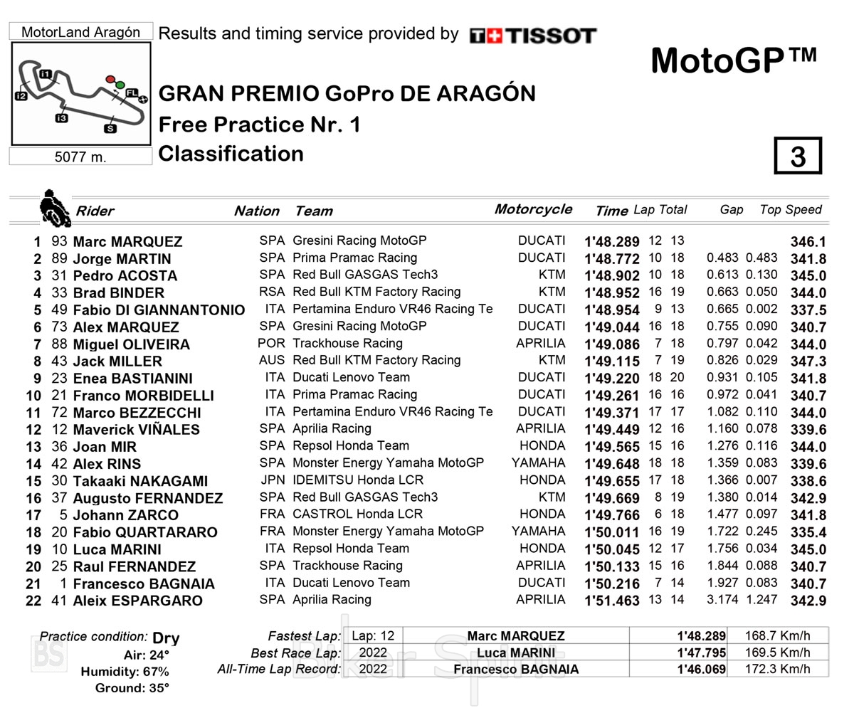 Ο Marc Marquez ταχύτερος στα πρώτα ελεύθερα δοκιμαστικά FP1 στο Aragon – Αποτελέσματα