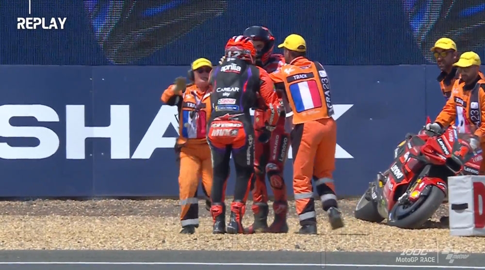 Στο μεταξύ πίσω γίνονταν φοβέρες μάχες, όπου μερικές από αυτές είχαν άσχημο αποτέλεσμα όπως αυτή των Pecco Bagnaia με Maverick Vinales που κατέληξε με πτώση και των δυο και με αποτέλεσμα να δούμε τους δυο οδηγούς να πιαστούν στα χεριά, κάτι που δεν θυμάμαι να έχω δει στην μεγάλη κατηγορία MotoGP! Ήταν μια ντροπιαστική στιγμή για το MotoGP.